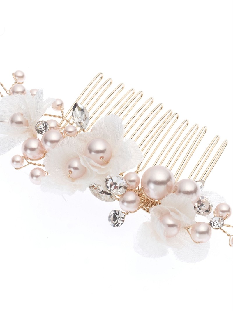 - Ivoorkleurige stoffen bloemetjes, rosékleurige parels en strasssteentjes