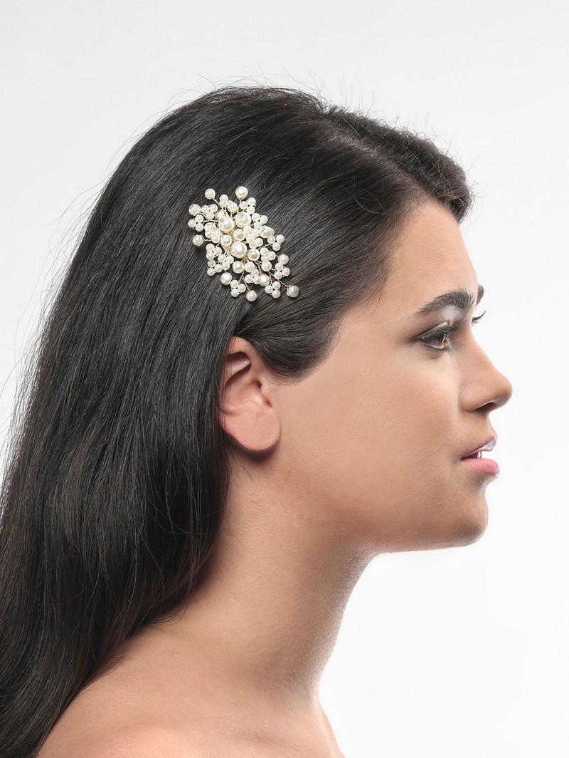 - Haarsieraden met een floraal thema van bloemen of planten zijn tijdloos en zijn nooit out of fashion geweest, zo ook haarsieraad BB-248 uit de Romantic Collection van Poirier. Dit haarsieraad heeft een basis die uit een zilverkleurige haarclip bestaat. Het sieraad zelf bestaat uit verschillende zilverkleurige takjes met aan de uiteinden klein en middelgrote ivoorkleurige parels. De opbouw van dit haarsieraad komt overeen met een takje van een sneeuwbes. Je kunt het haarsieraad verwerken in allerhande bruidskapsels, zowel los gedragen, maar bijvoorbeeld ook opgestoken of in een knotje. Door de combinatie zilver en ivoor van het haarsieraad kan dit ook worden gecombineerd met verschillende kleuren en modellen van jurken.