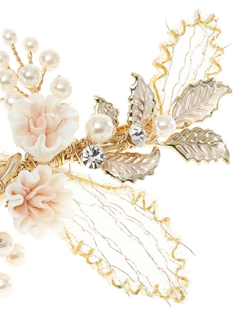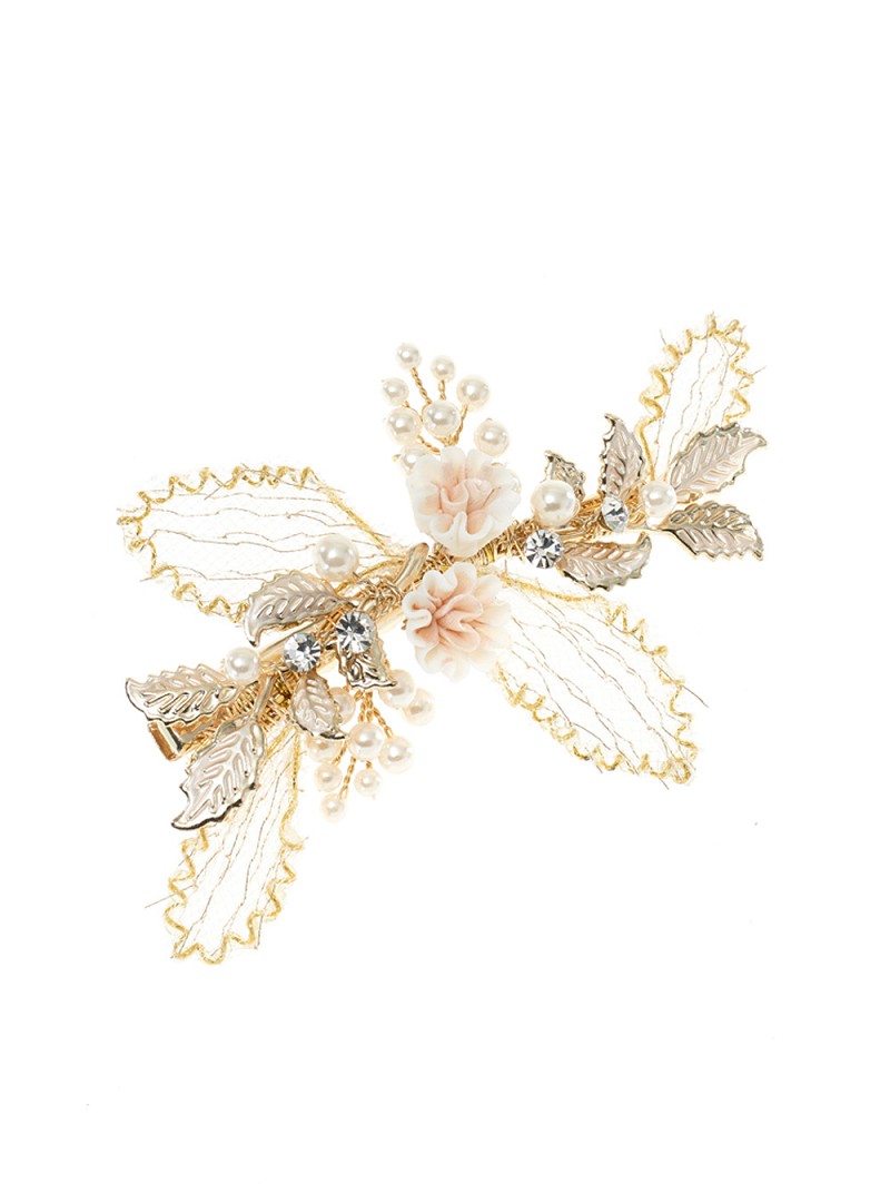 - Goudkleurige clip met goudkleurige blaadjes, blushkleurige porseleinen bloemetjes, strassteentjes en ivoorkleurige parels