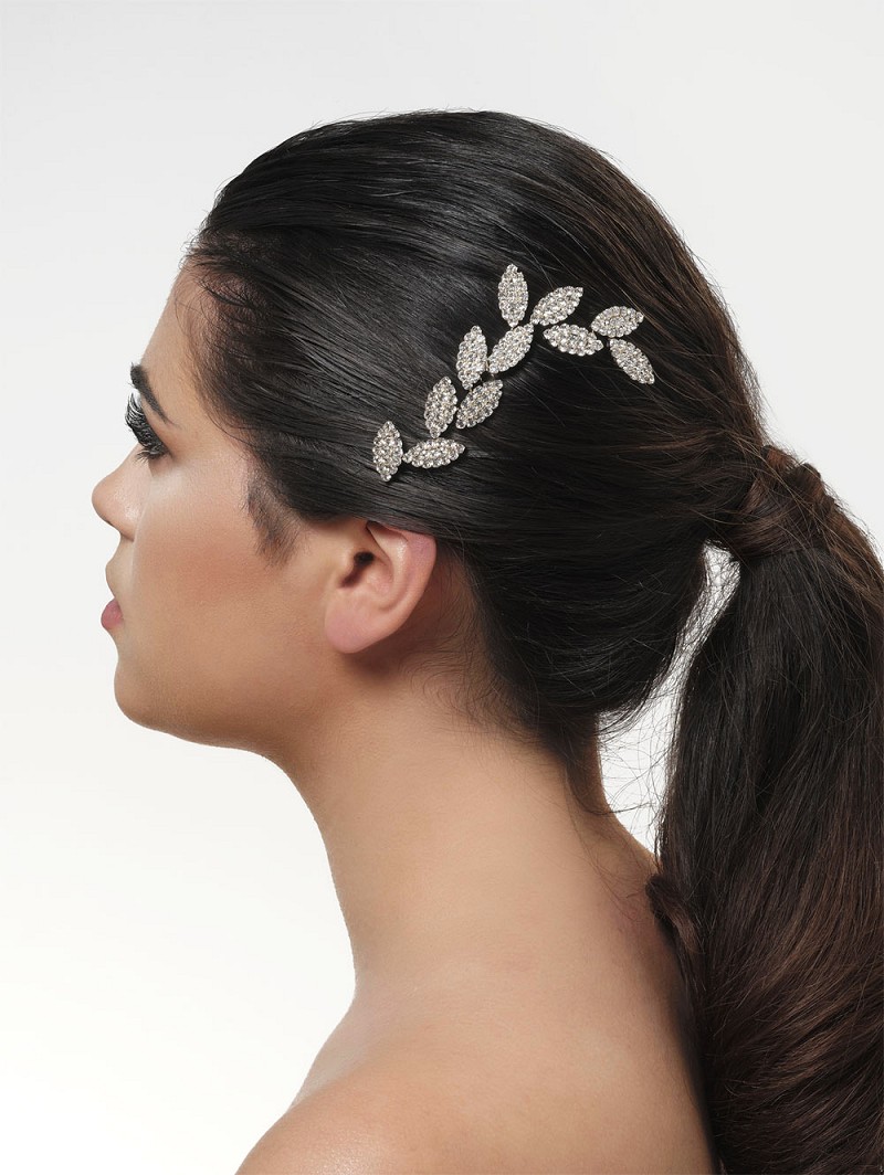 - Je kunt een unieke trouwlook creëren met dit goud- of zilverkleurige haarsieraad in bladvorm met strasssteentjes op kam, omdat de vorm van dit haarsieraad bijzonder is. Verwerk dit speciale item in jouw wedding look en val op doordat je als een ware fashionista oog hebt voor de kleinste details. Deze kam kan verwerkt worden in verschillende type bruidshaarstijlen.