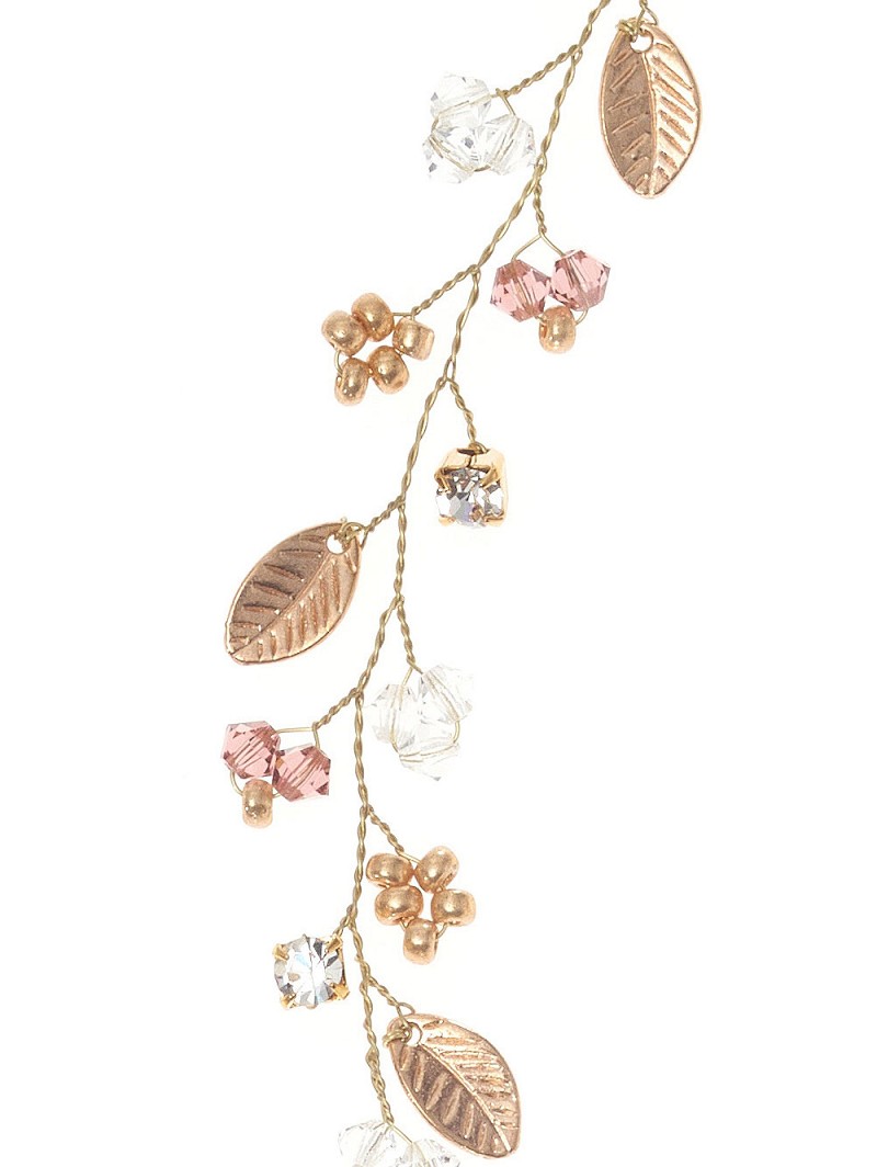 - Goudkleurige draad versierd met goudkleurige blaadjes, goudkleurige kraaltjes, rosékleurige en naturel kristalletjes en strasssteentjes
