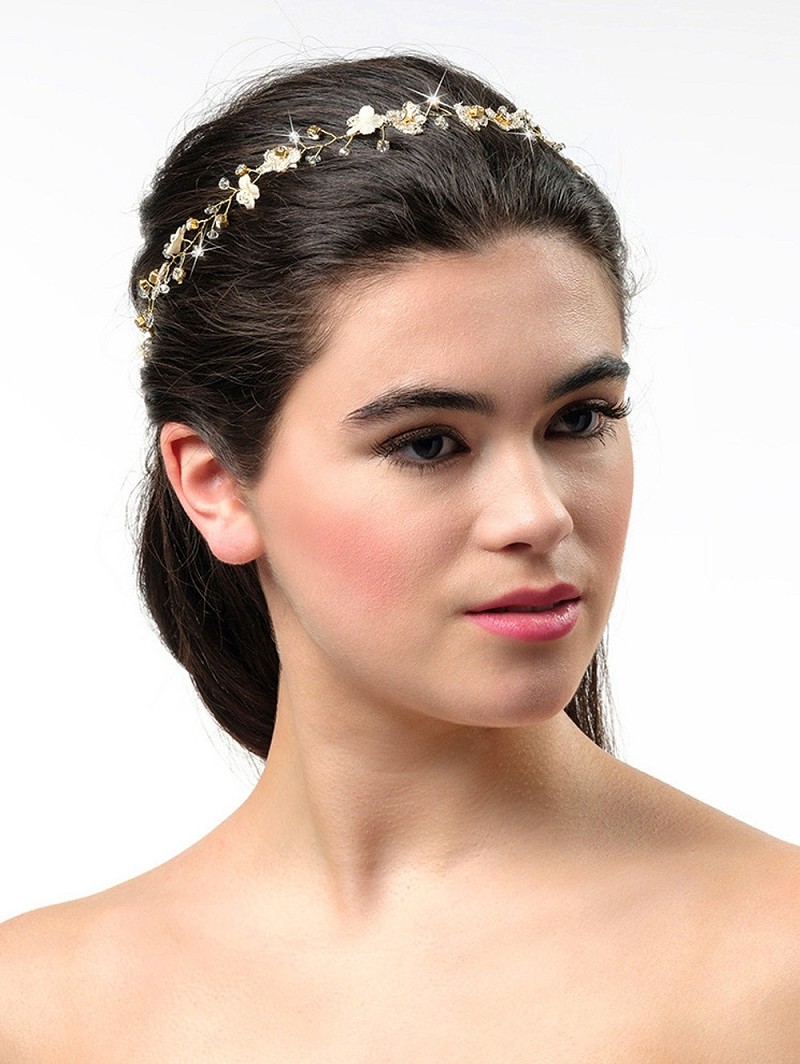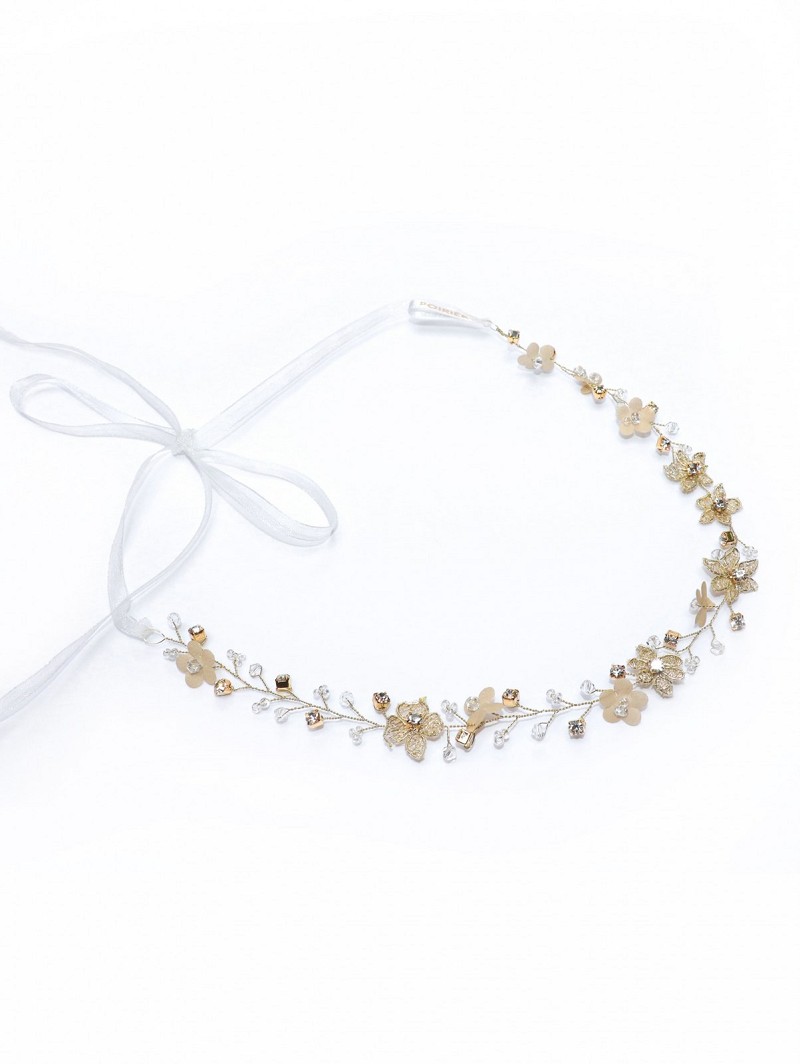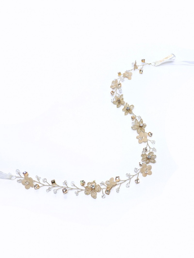 - Wanneer jij kiest voor natuurlijke vormen om jouw festival wedding look te creëren, kies dan voor de bijzondere items uit de Festival Collection van Poirier. Dit haarsieraad dat een goudkleurige basis heeft, is versierd met goudkleurige bloemetjes, stoffen champagnekleurige bloemetjes, naturel kristalletjes, kraaltjes en strasssteentjes. Het sieraad past bij allerhande bruidskapsels waardoor jij precies de wedding-look kunt samenstellen die jij graag wil.