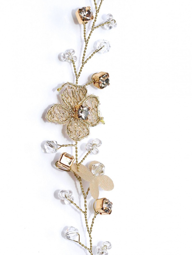 - Goudkleurige basis, goudkleurige bloemetjes, stoffen champagnekleurige bloemetjes, naturel kristalletjes en strasssteentjes