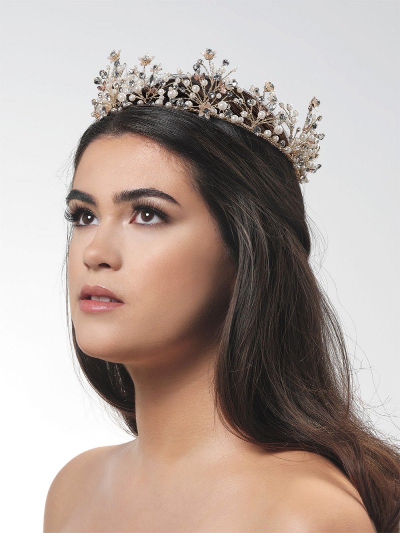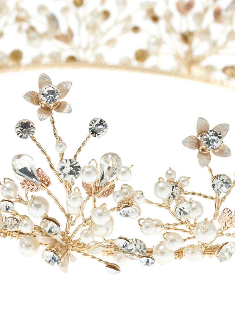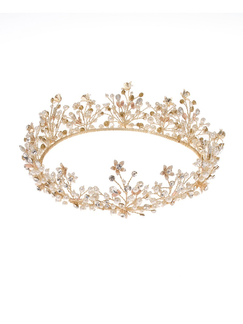 - Deze goudkleurige kroon is vervaardigd uit roségoudkleurige blaadjes, goudkleurige bloemetjes, ivoorkleur parels en strassteentjes. Dit haarsieraad maakt jouw prachtige, romantisch look compleet tijdens jouw mooiste dag. Te dragen zowel bovenop het hoofd of bovenop een sluier.
