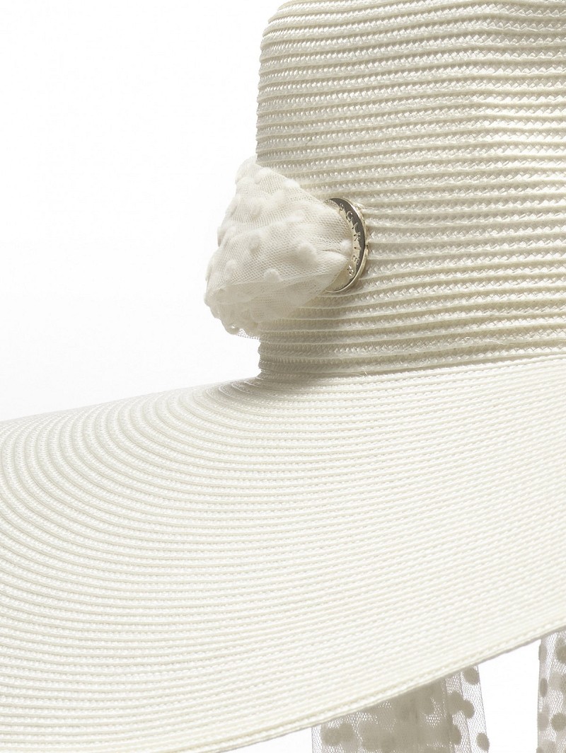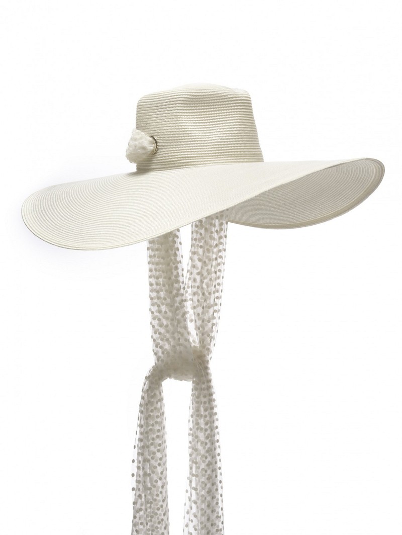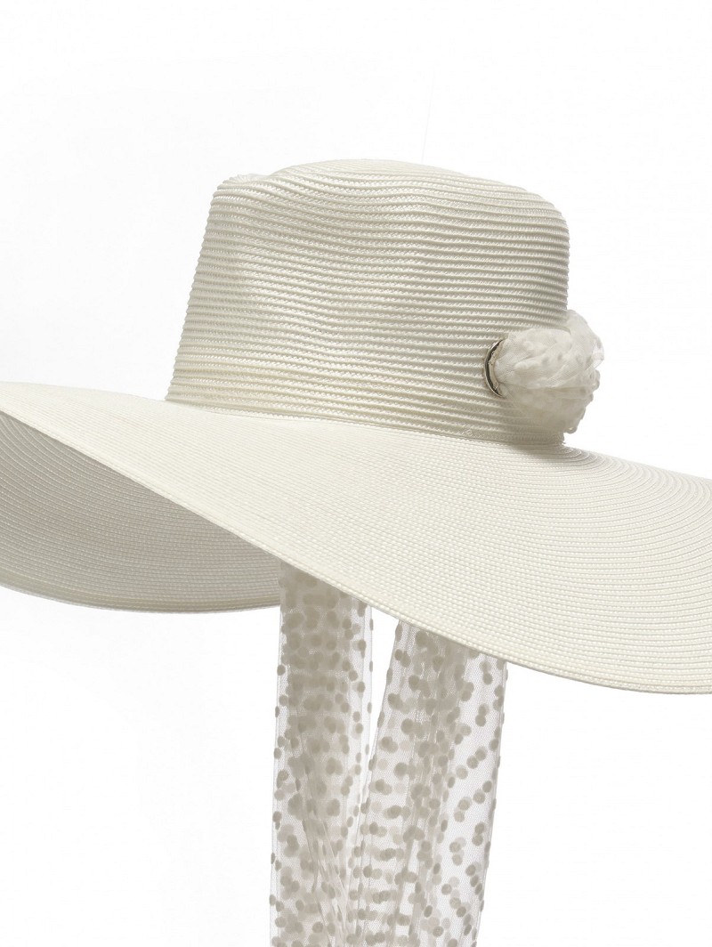 - Ivoorkleurige hoed met een ivoorkleurige polkadot sluier erdoorheen geregen