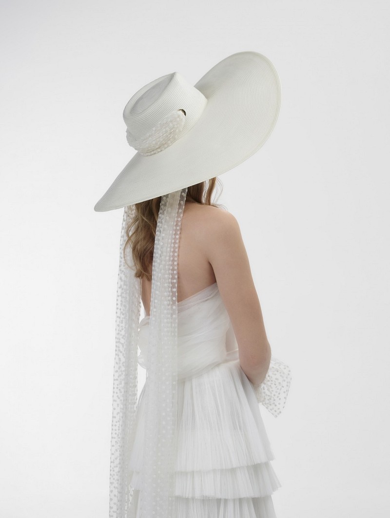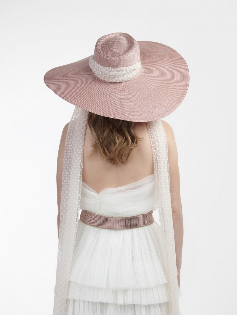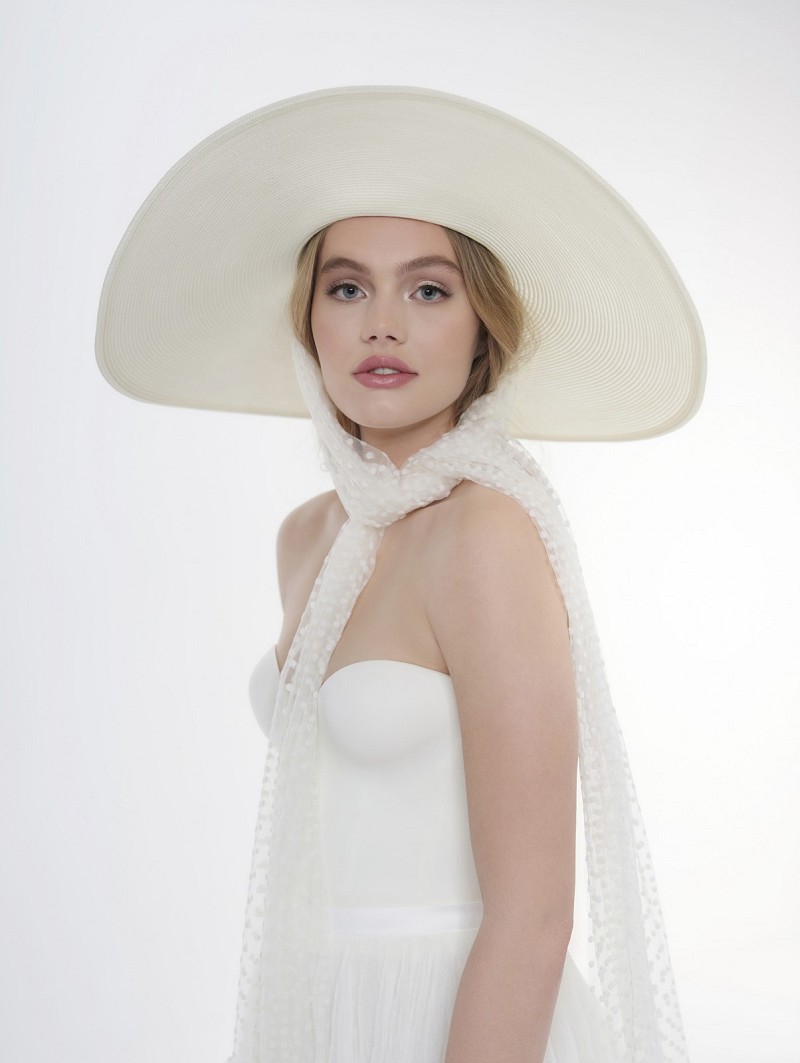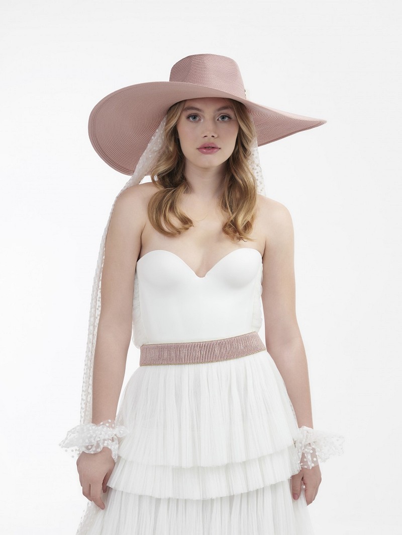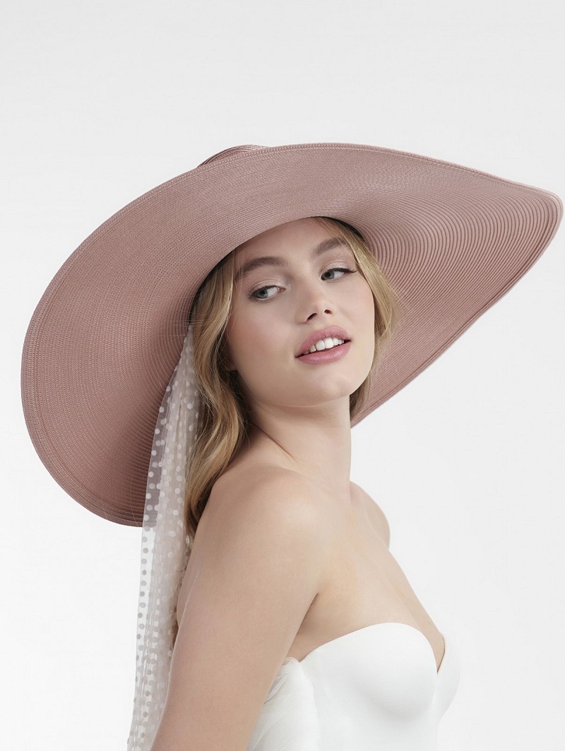 - Kenmerken: ivoorkleurige of vintage pinkkleurige hoed, ivoorkleurige of blushkleurige polkadot sluier