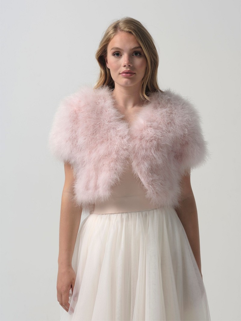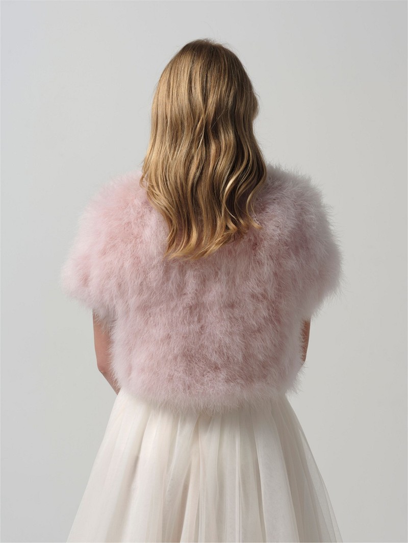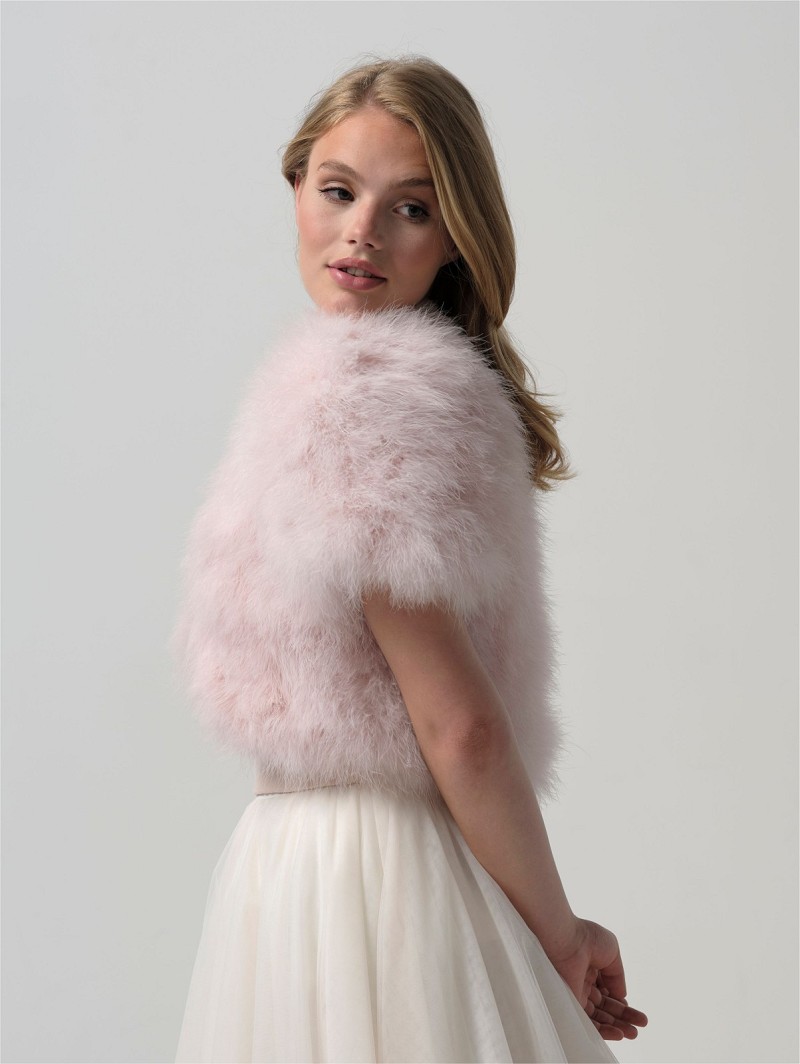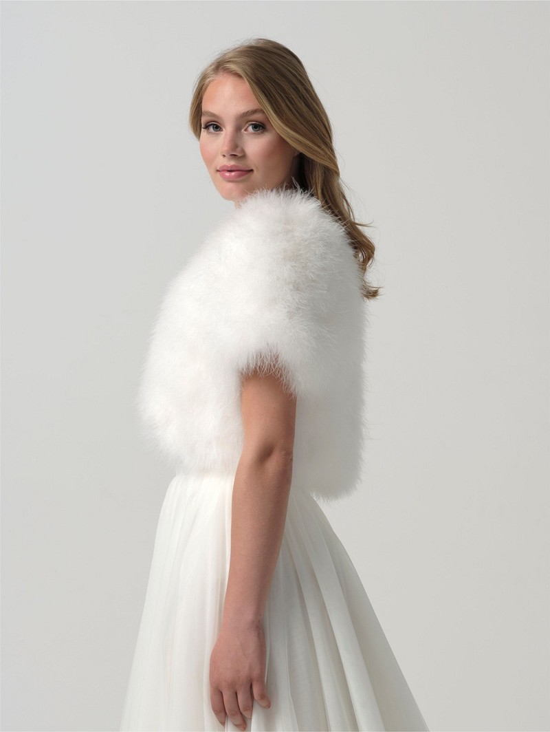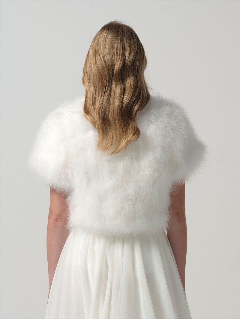 - Wanneer je graag een deluxe bridal-look wil, kies dan voor deze bolero van echte maraboeveren die verkrijgbaar is in de kleuren ivoor en blush. De bolero heeft korte mouwen en een voering van satijn. Daarnaast is deze bolero middenvoor te sluiten middels een haak- en oogsluiting. Draag deze bolero als finishing-touch van jouw wedding-look, maar ook wanneer het tijdens een avondfeest buiten afkoelt. Deze bolero is uni-size.