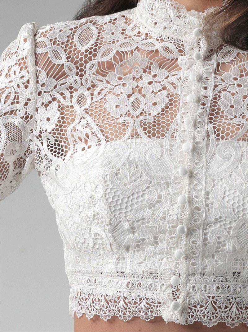 Bridal jacket gemaakt van Franse kant met mouwen met dubbele manchetten en stoffen knoopjes middenvoor | Deluxe uitvoering | Rosa-lijn