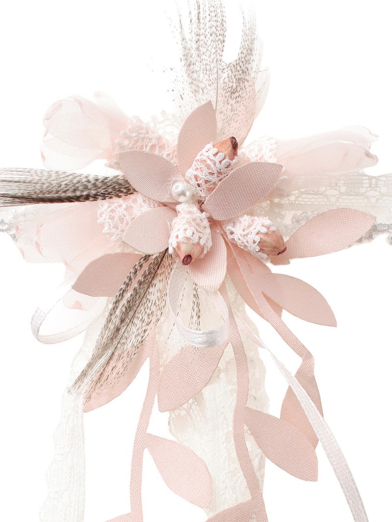- Kenmerken: kousenband, blushkleurige bloemetjes en blaadjes, natural veertjes