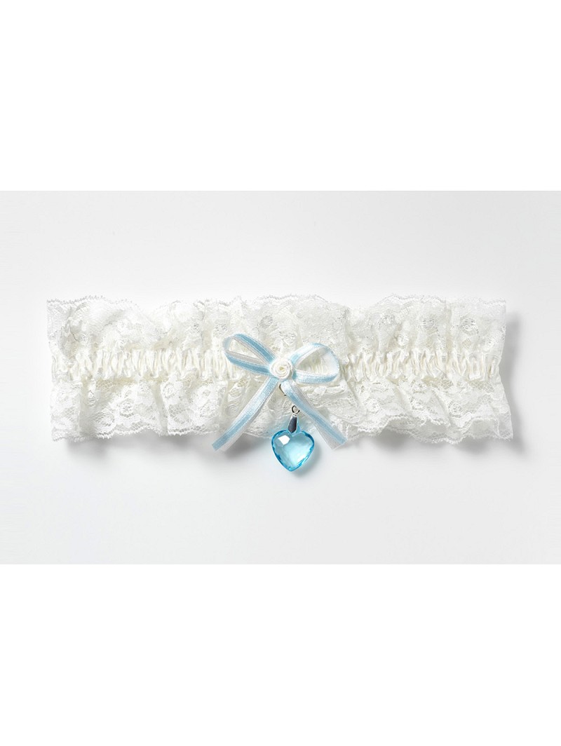 Kanten kousenband in één kleur, voorzien van een blauw strikje en een afneembaar blauw hartje. Breedte kousenband 5 cm.