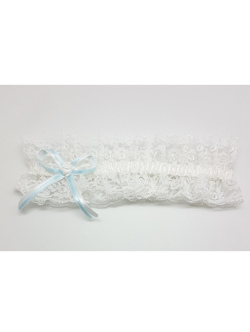 Kanten kousenband met een blauw strikje. Breedte: 5 cm. Het blauwe strikje is onmisbaar bij de kousenband omdat men graag iets blauws draagt op de trouwdag. 'Something Old, Something New, Something Borrowed, Something Blue'.