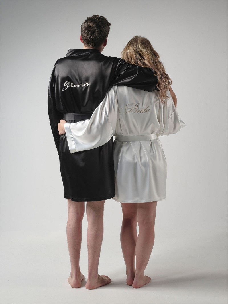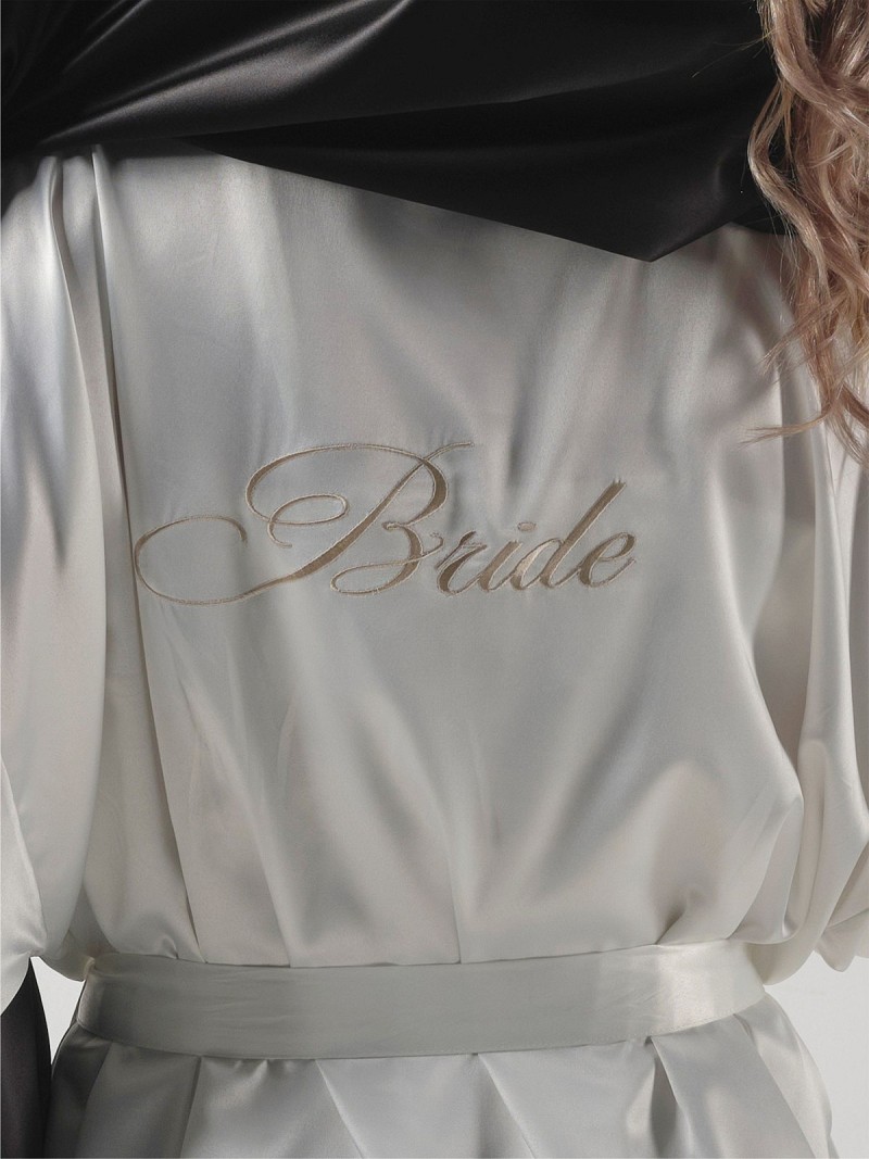 Kimono gemaakt van ivoorkleurige satijn met in goud het woord “Bride” geborduurd