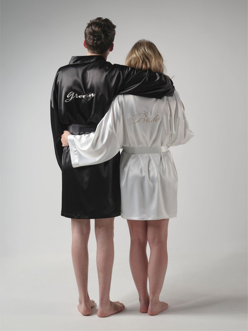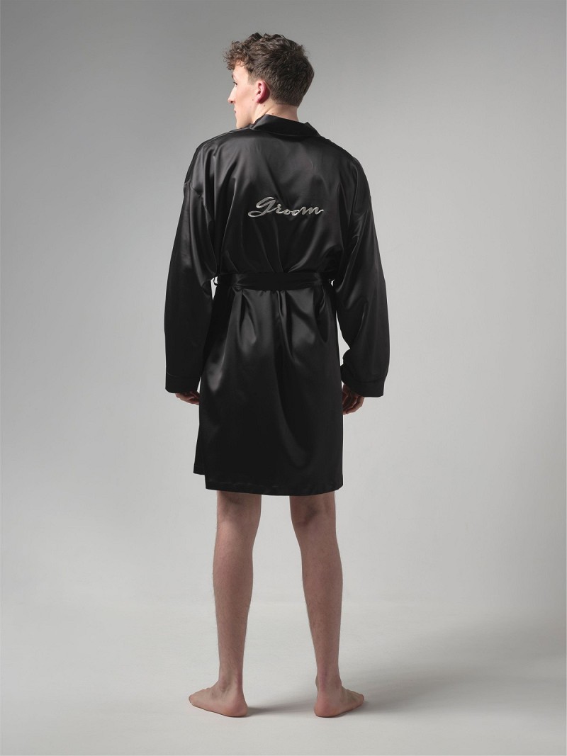 Kimono gemaakt van zwarte satijn met middenachter het woord “Groom” geborduurd