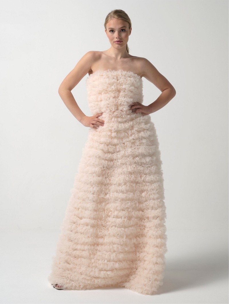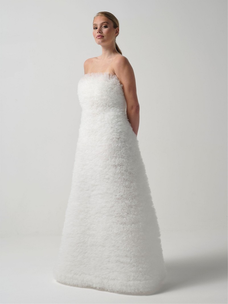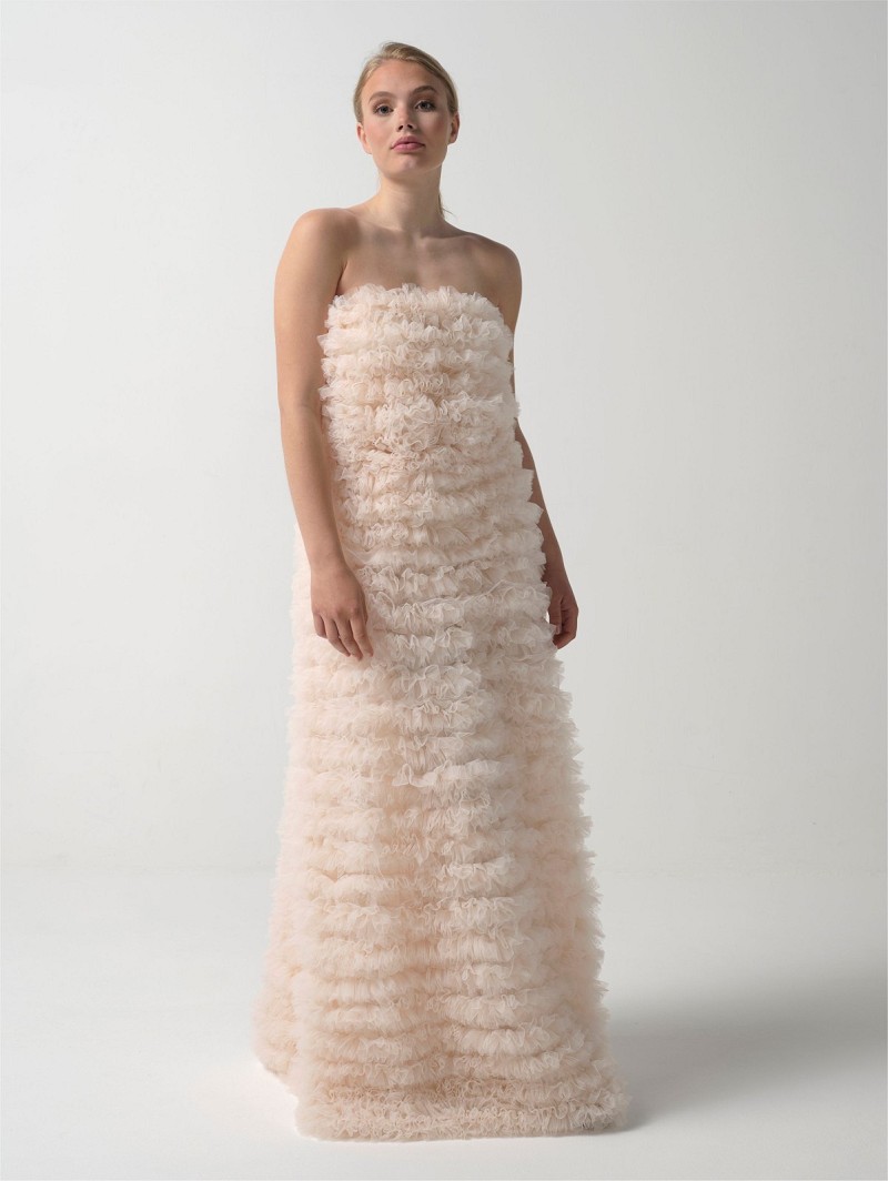 - Kenmerken: bruidsjurk bestaande uit roesjes van tule, verkrijgbaar in de kleuren ivoor en blush, met middenachter een ritssluiting, lengte: 160 cm, maten: XS t/m XL