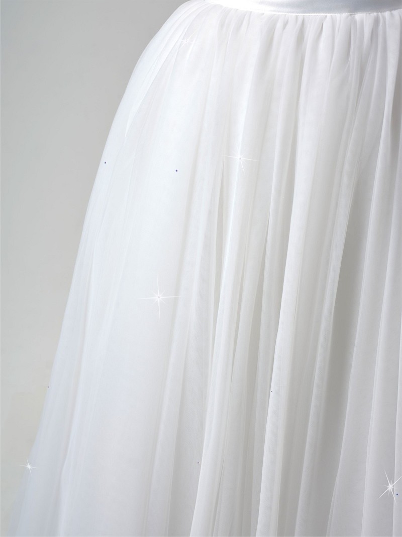 Bruidsrok gemaakt van ivoorkleurige soft-tule met een versiering van strasssteentjes