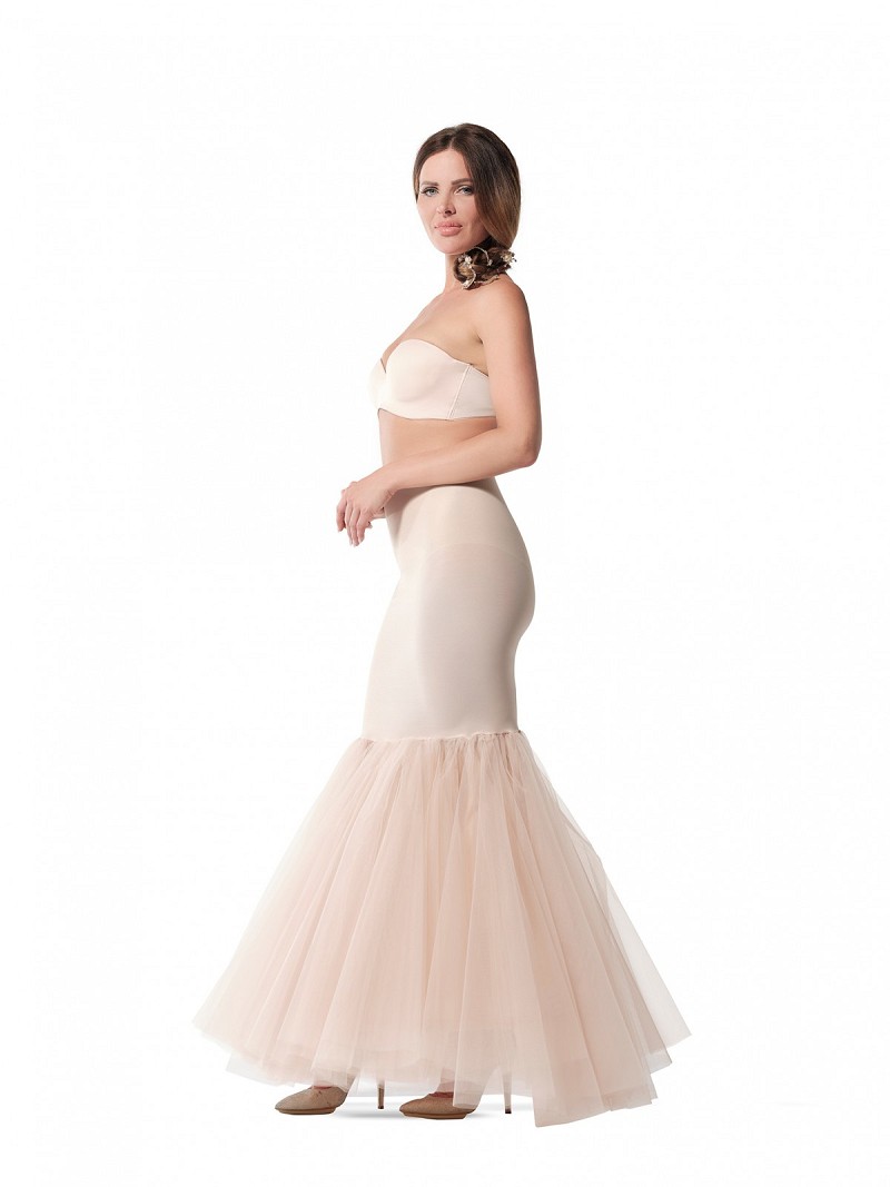 - Wanneer je de mooiste pasvorm van jouw jurk wil bereiken, kies dan voor deze petticoat met zeemeerminsilhouet. De petticoat heeft onderaan een omvang van 180 cm en is verkrijgbaar in de kleuren ivoor en skin. Daarnaast heeft deze petticoat 1 balein, voor het creëren van het mooiste silhouet van jouw bruidsjurk. Deze petticoat is gemaakt van een lichtcorrigerende jerseystof en enkellaagse sluiertule.