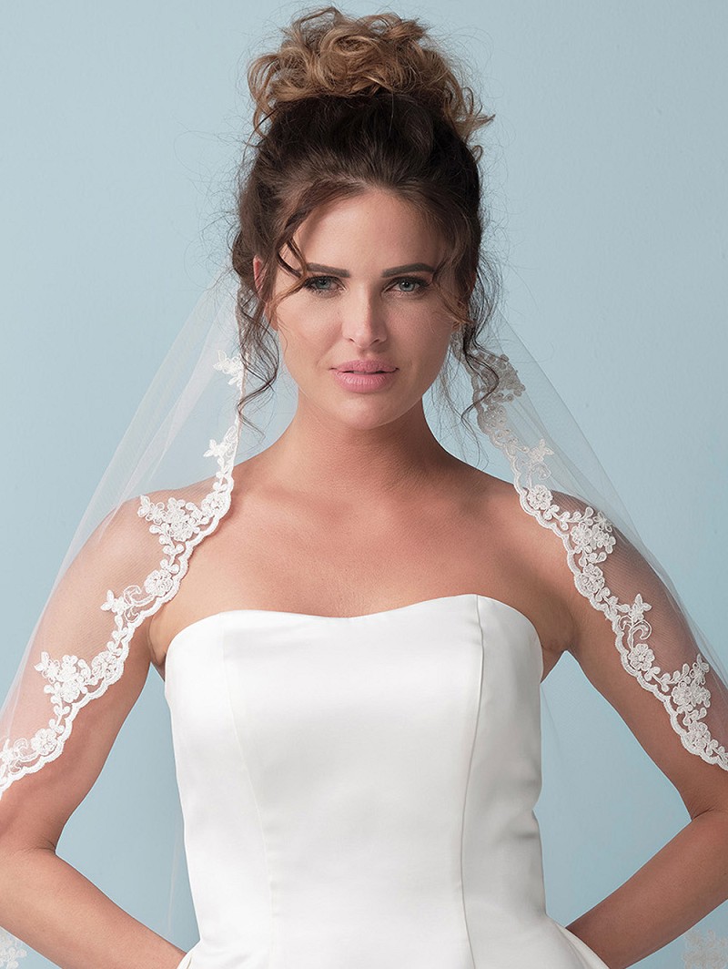 - Wanneer je kiest voor een memorabele wedding-look, kies dan voor sluier S50-210/1/Med. Deze ivoorkleurige sluier is gemaakt van enkellaagse medium-tule en fijne kant, versierd met een bloemmotief, pareltjes en pailletjes. Deze sluier is 210 cm lang. Er zijn meerdere varianten van deze sluier verkrijgbaar bij Poirier. Kies voor een geweldige bridal look met de producten van Poirier.