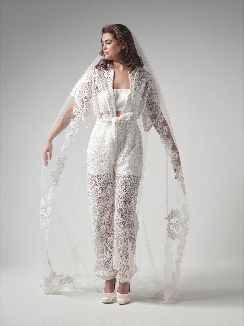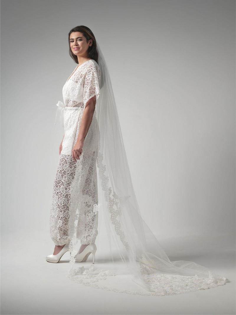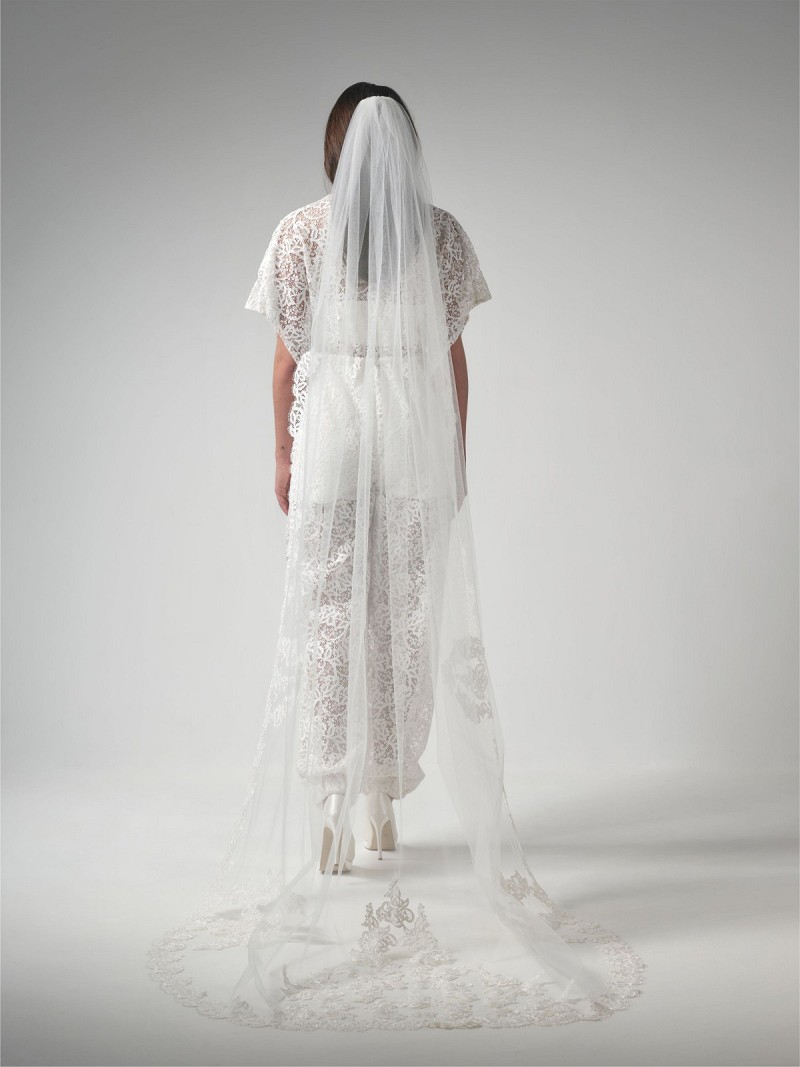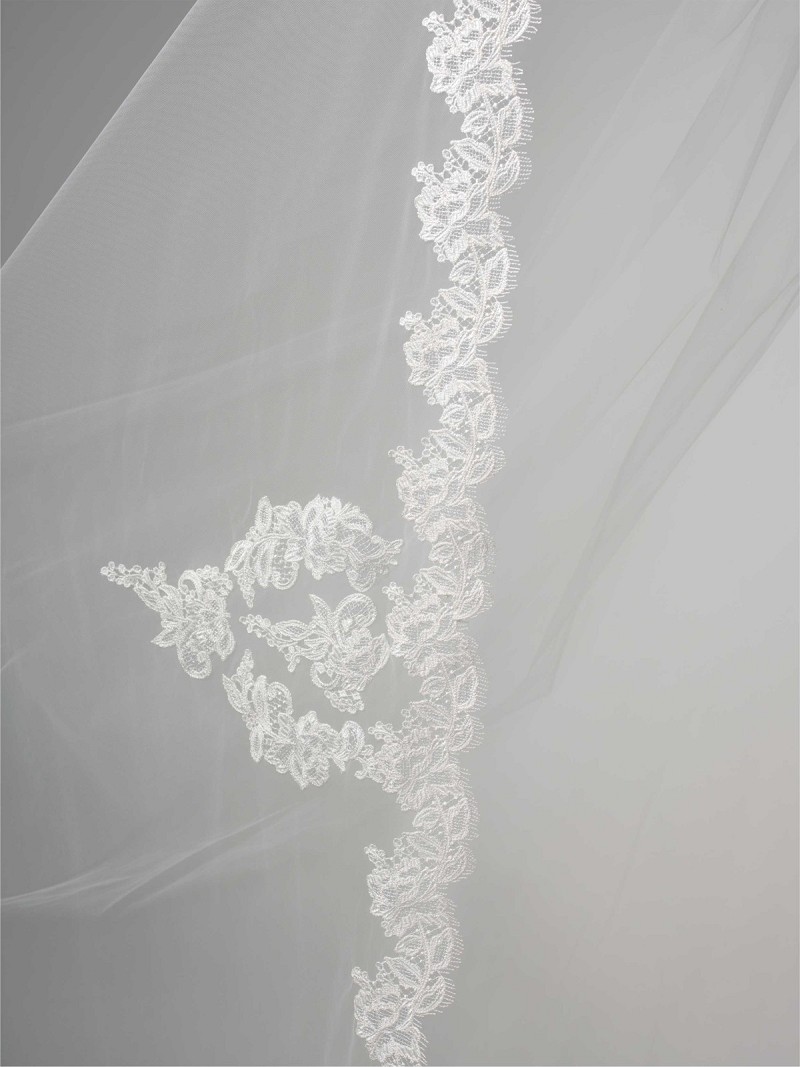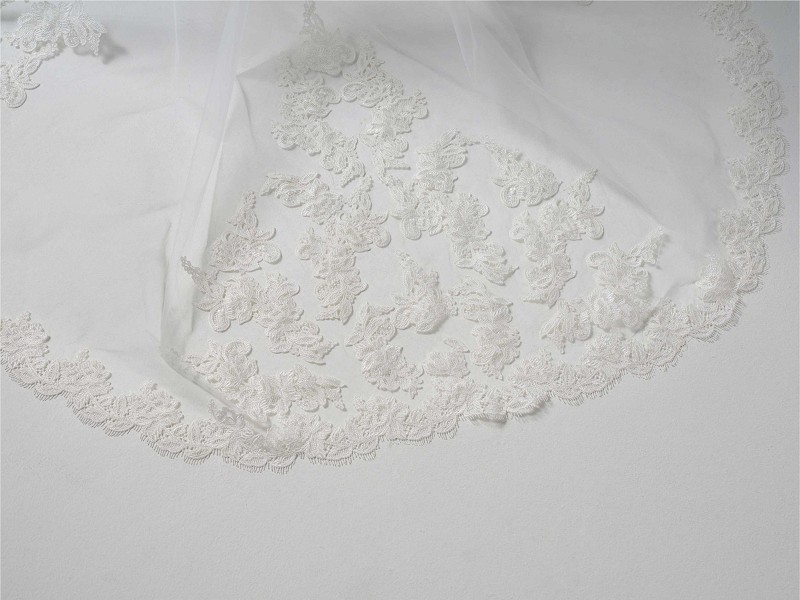 Sluier van enkellaagse medium-tule versierd met bloempatroon van coupure kant | Lengte: 250 cm | Rubia-Lijn