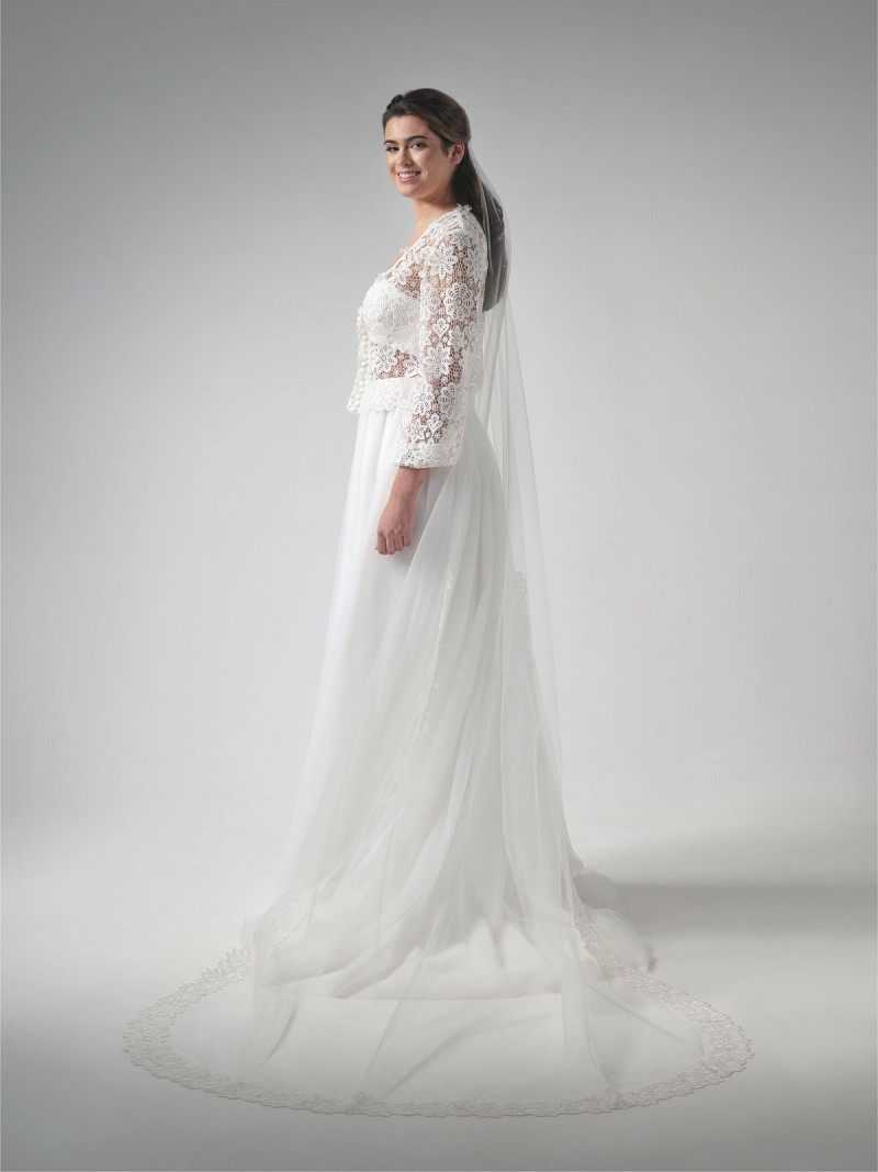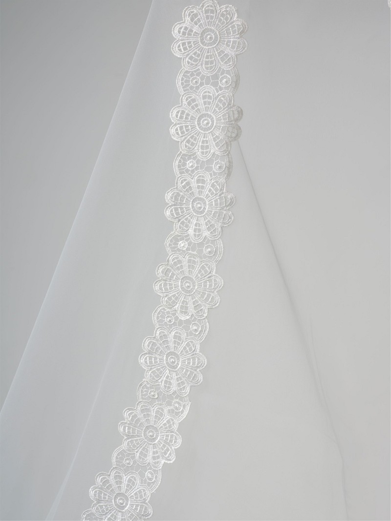 Sluier gemaakt van enkellaagse medium-tule versierd met een rand met een geborduurd bloemmotief | Lengte: 280 cm | Perla-lijn