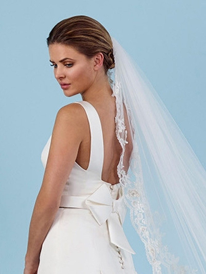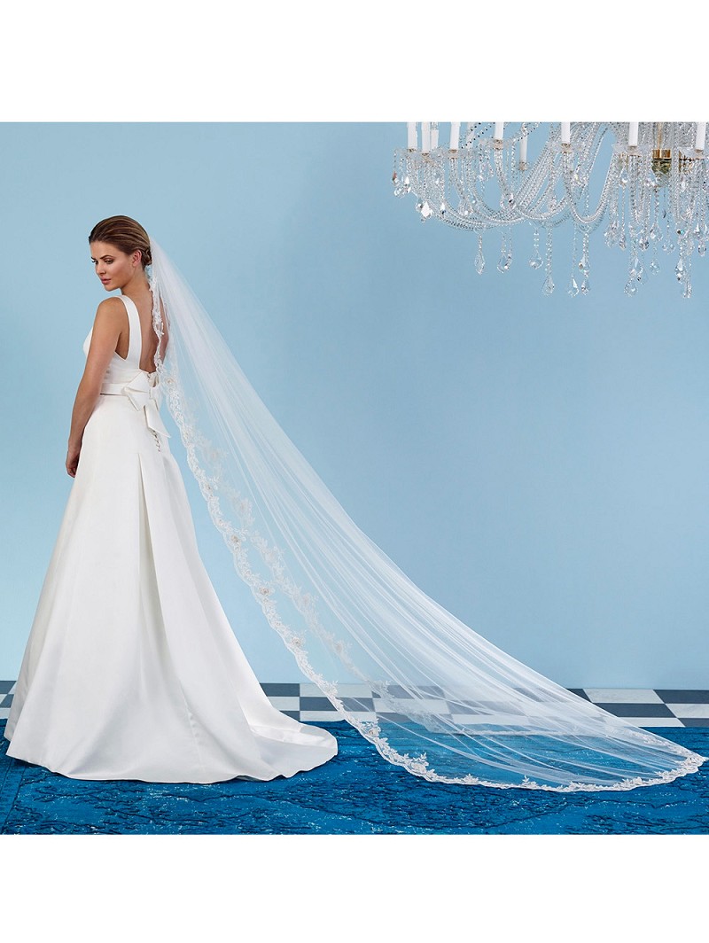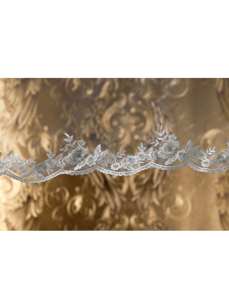 Enkellaags sluier van medium tule versierd met bloemetjeskant in de kleuren ivoor, ivoor/goud of ivoor/zilver. Lengte 280 cm.