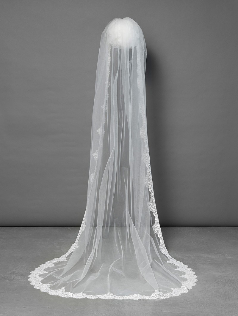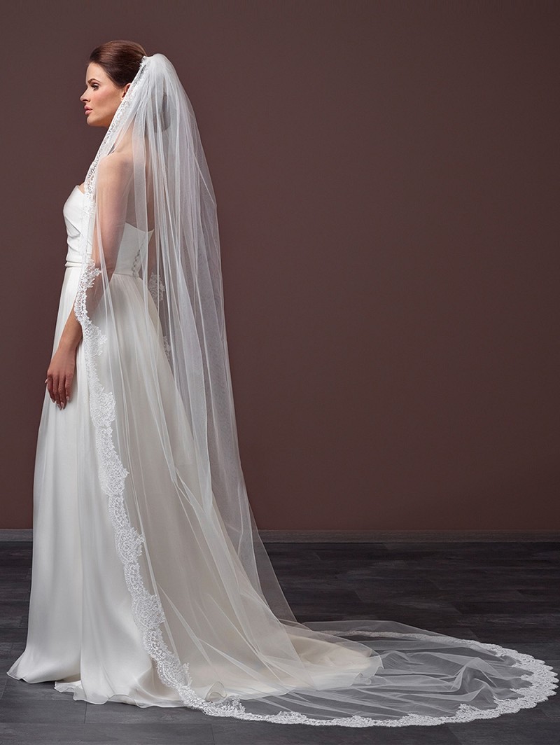 Enkellaags sluier in medium tule bewerkt met Franse kant. Lengte 280 cm.