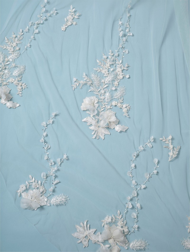 Enkellaagse sluier van soft-sluiertule met een versiering van borduursels in een floraal patroon