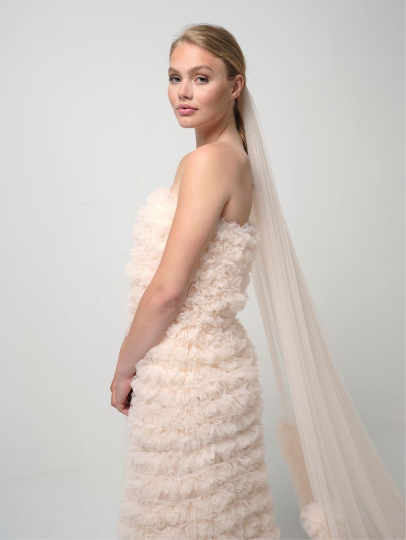 - Kenmerken: Sluier gemaakt van enkellaagse soft-tule, versierd met een brede rand tule roesjes, 300 cm lang, verkrijgbaar in de kleur ivoor en blush