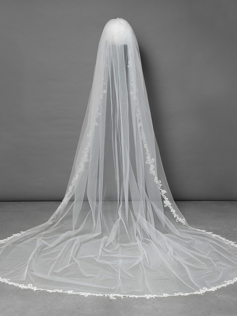 Sluier gemaakt van enkellaagse medium-tule met een versiering van kant met pailletten | 350 cm lang