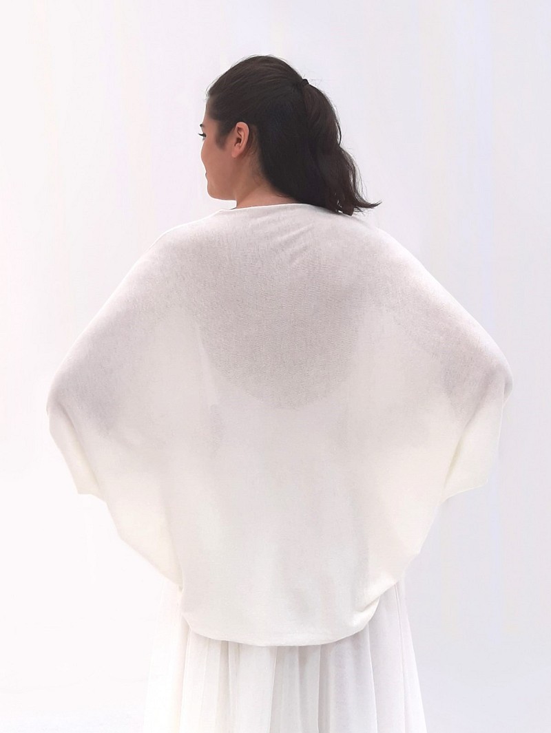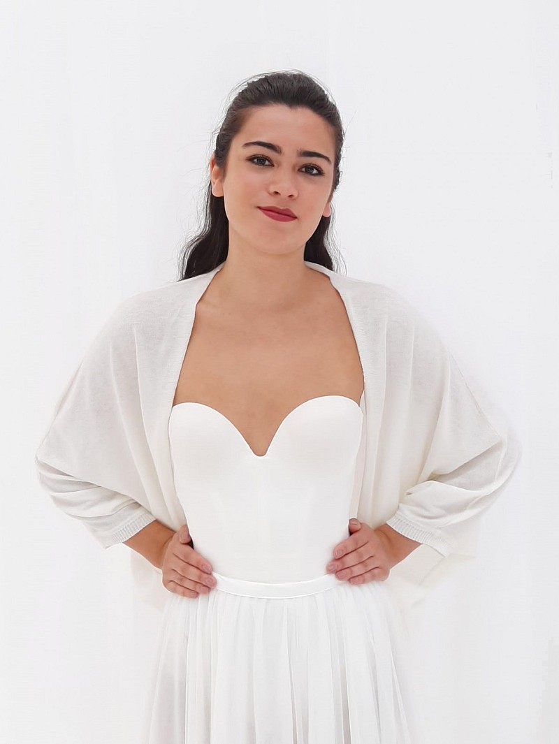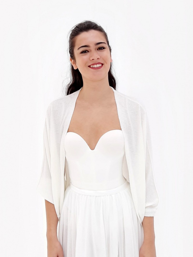 - De ivoorkleurige cardigan S188 uit de Essential Collection van Poirier is gemaakt uit een samengestelde stof (16% wol, 20% acryl, 20% nylon, 44% polyester). Deze cardigan met een neutrale kleur is prachtig te combineren met verschillende typen bruidsjurken. De cardigan heeft als maat “one size fits all”.