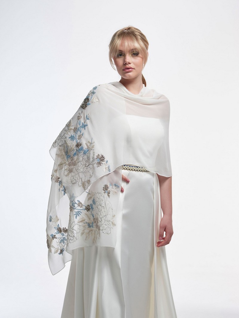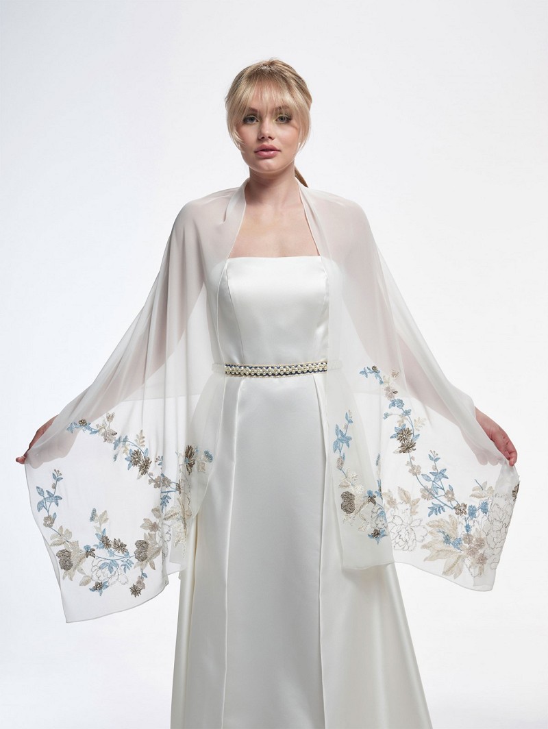 - Wanneer je op zoek bent naar een decoratieve stola, kijk dan eens naar stola S182 uit de Trend Collection van Poirier. Deze stola is gemaakt van ivoorkleurige chiffon met een versiering van een geborduurd bloemenpatroon in de kleuren (donker)bruin, blauw, ivoor en champagne. Daarnaast heeft deze stola een versiering van pailletjes en kraaltjes. De afmetingen van deze stola zijn de volgende: 60 cm breed en 200 cm lang. Draag deze stola op verschillende manieren, bijv. over de ellebogen. Deze stola is te combineren met verschillende typen trendy bruidsjurken en accessoires.