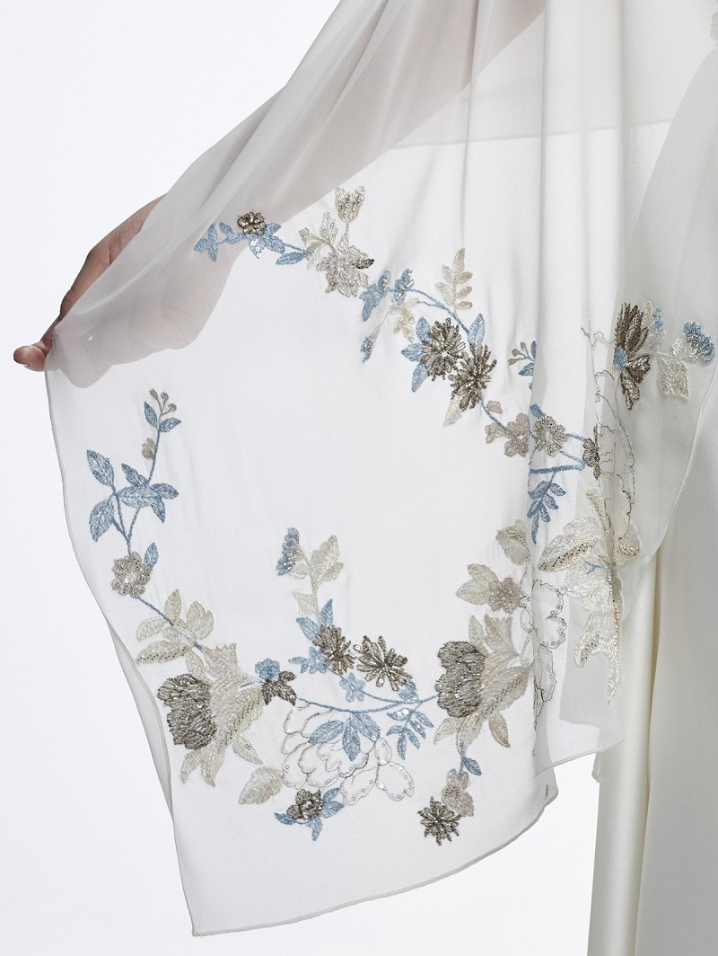 - Product: S182 – Ivoorkleurige chiffon stola met geborduurd bloemenpatroon van pailletjes en kraaltjes