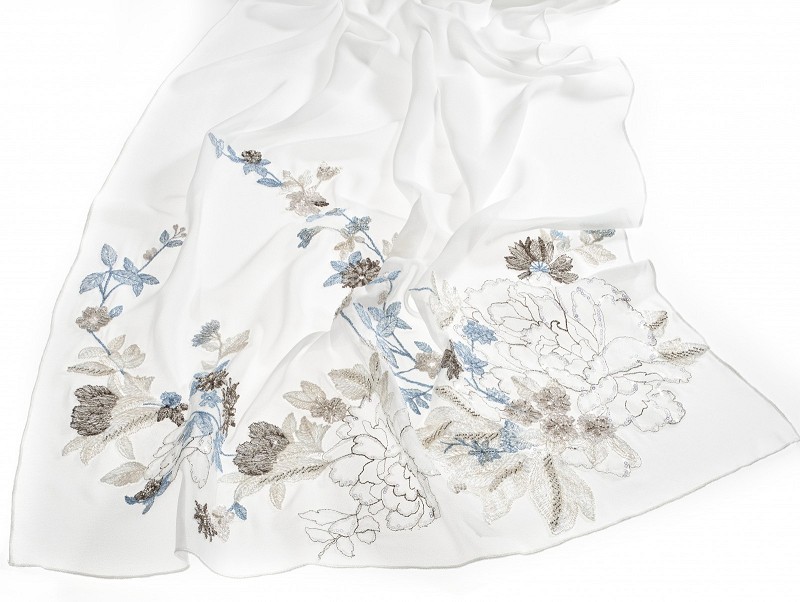 Ivoorkleurige chiffon stola met geborduurd bloemenpatroon van pailletjes en kraaltjes