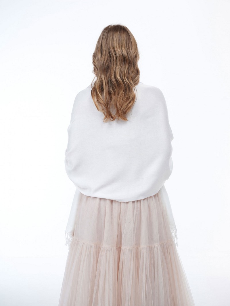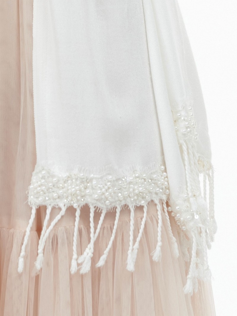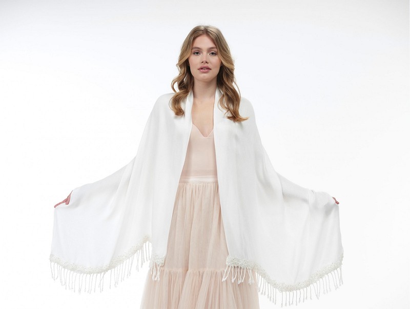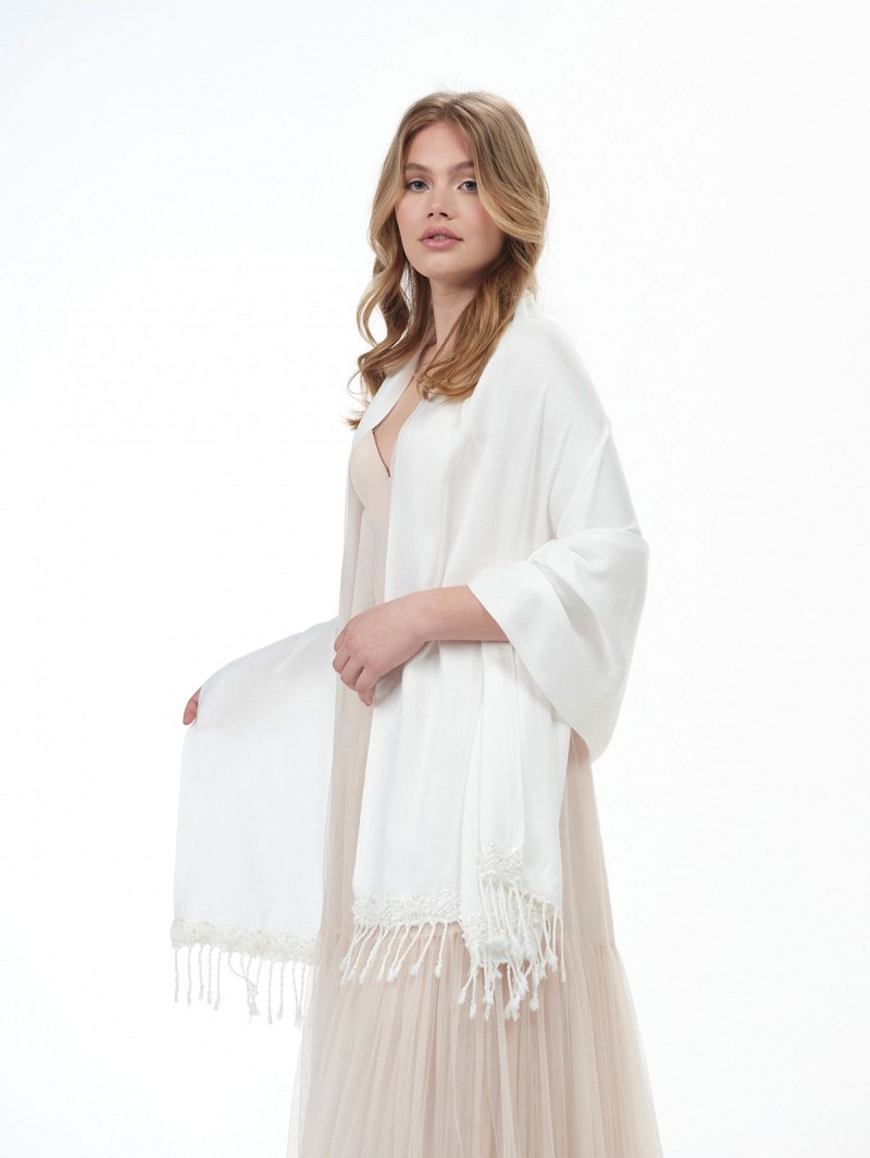 - Product: S180 – Ivoorkleurige stola met franjes aan de uiteinden en een versiering van ivoorkleurige pareltjes en fijne kant (pashima)