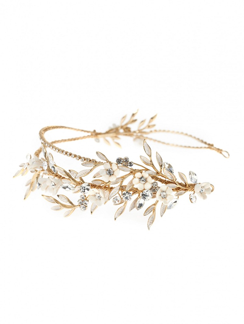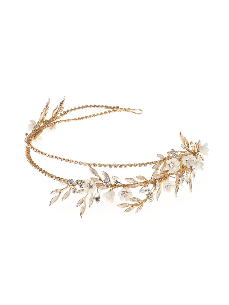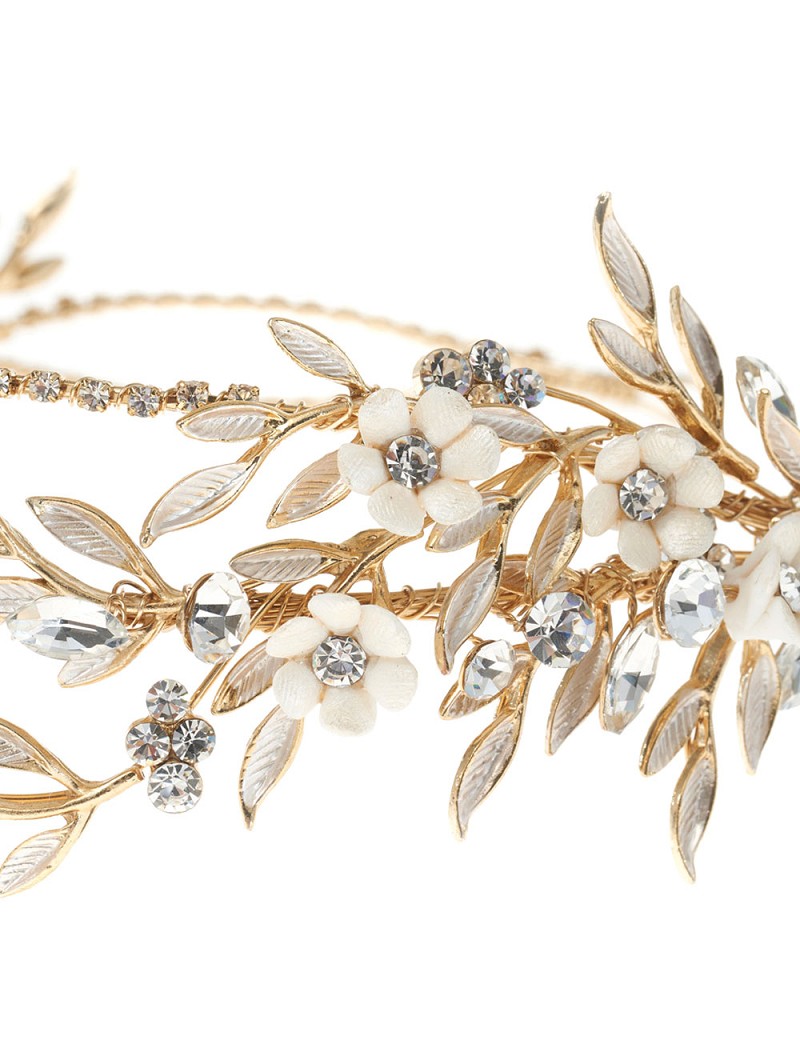 - Goudkleurige deluxe tiara met ivoorkleurige bloemetjes, parelmoerkleurige blaadjes en strassstenen in verschillende groottes
