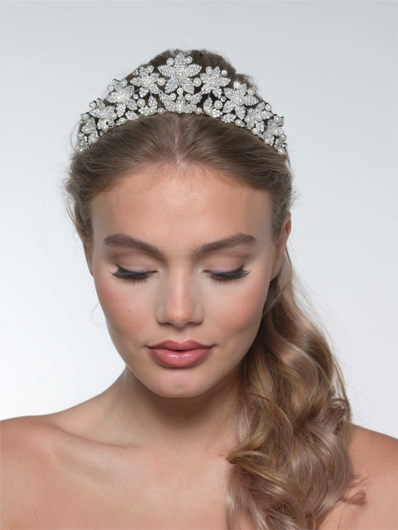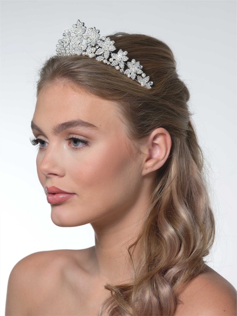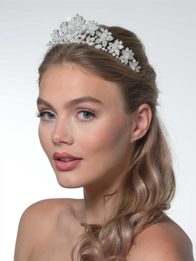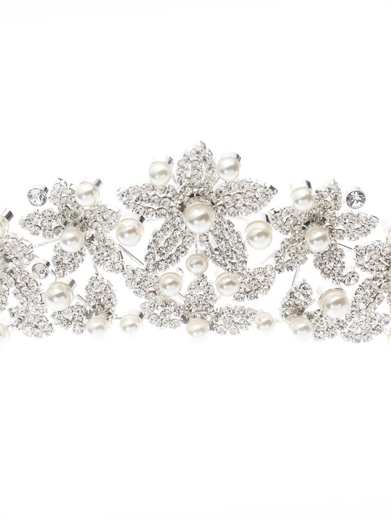 Tiara met een bloemmotief versierd met strasssteentjes en parels