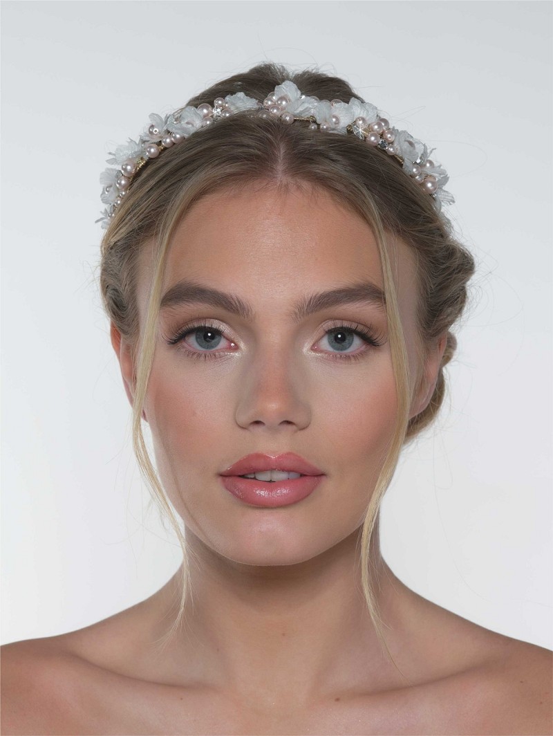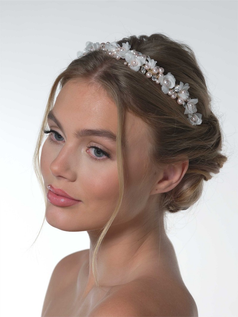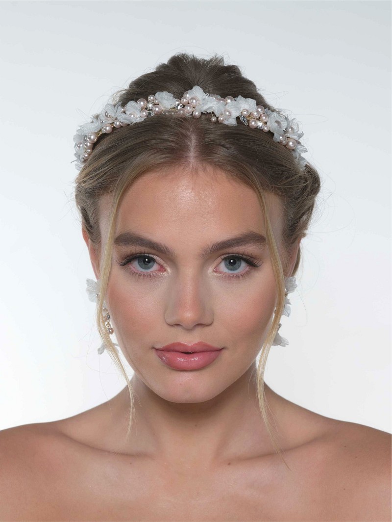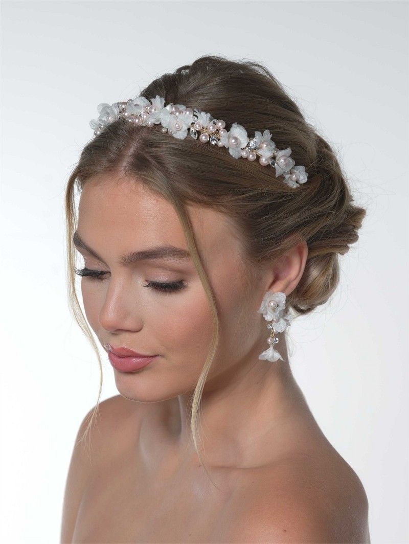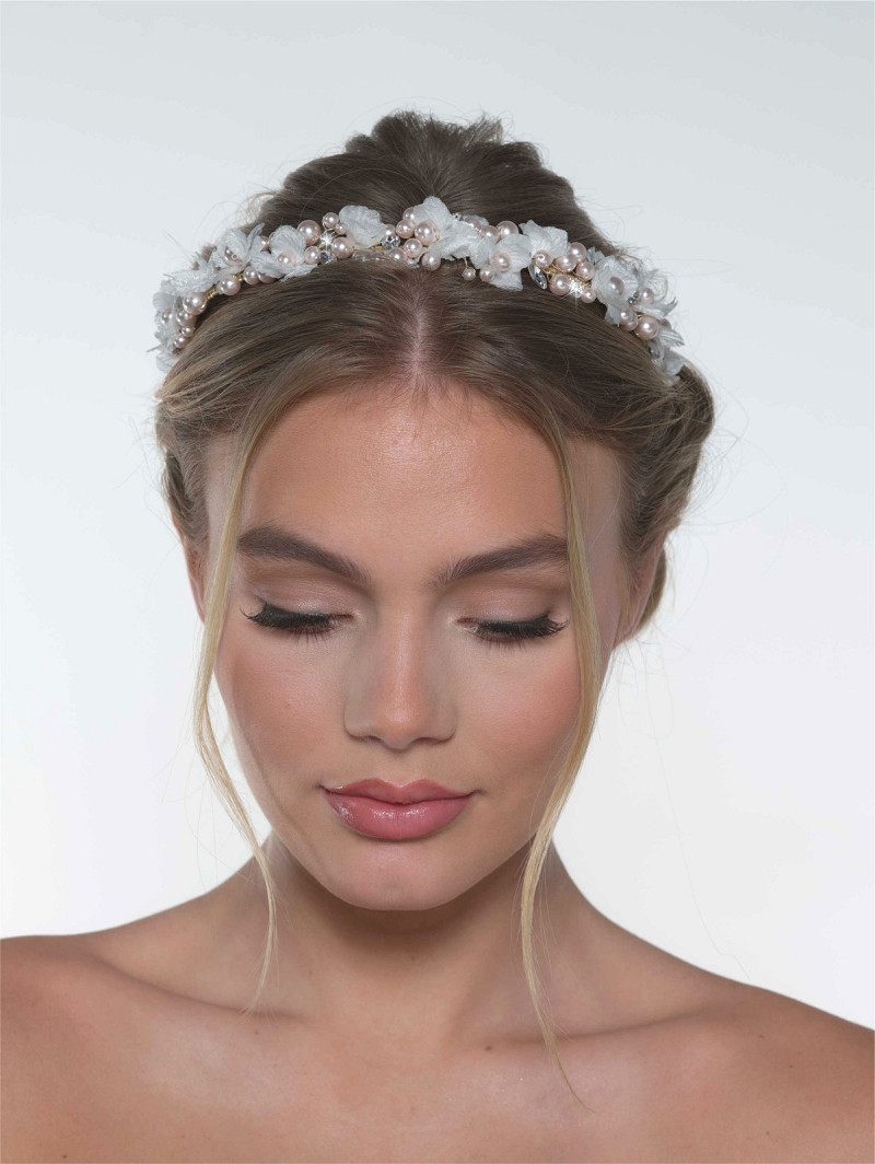 Tiara versierd met stoffen bloemetjes, parels en strasssteentjes