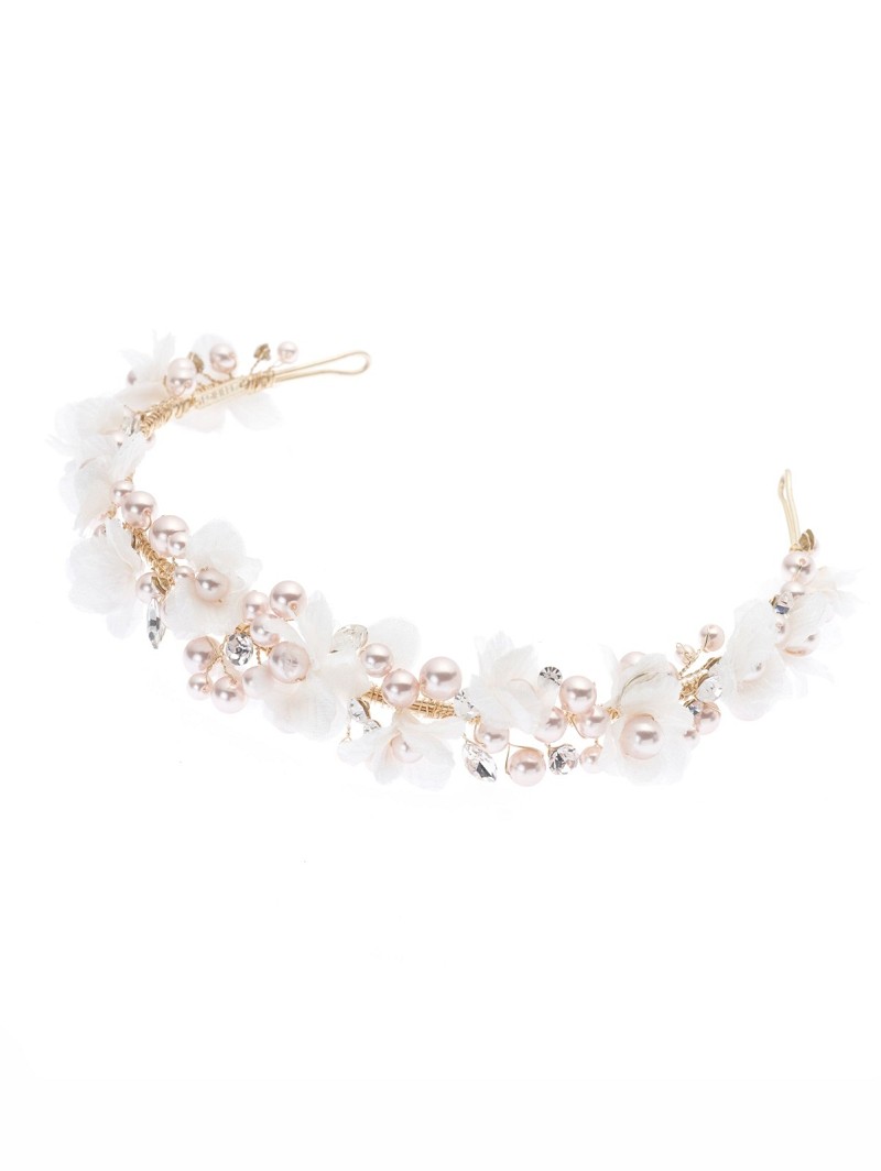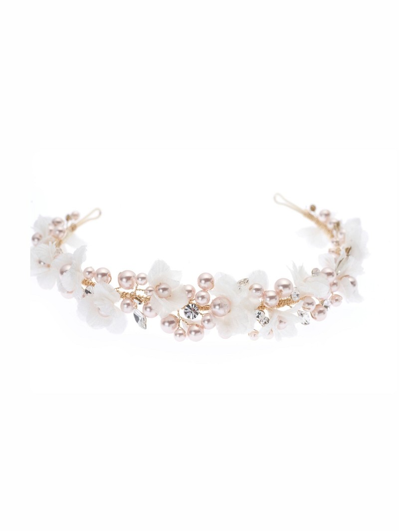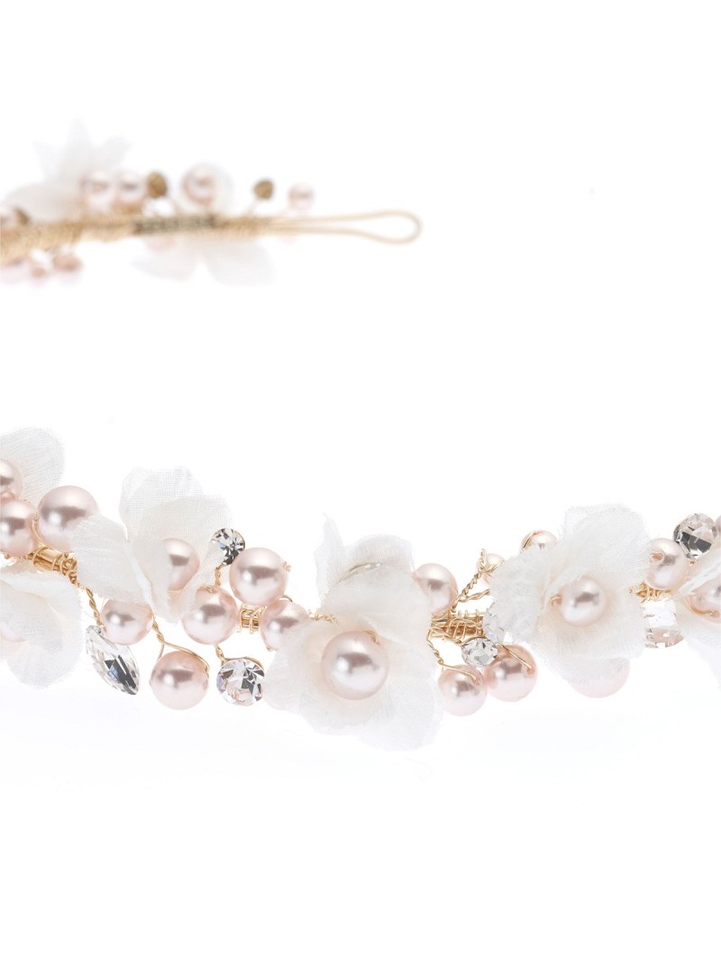 - Versierd met stoffen ivoorkleurige bloemetjes met rosékleurige parels en strasssteentjes