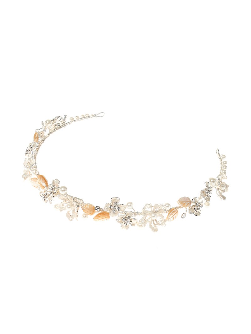 - Deluxe tiara versierd met zilverkleurige of goudkleurige of rosé goudkleurige bloemetjes, parelmoerkleurige blaadjes en strasssteentjes