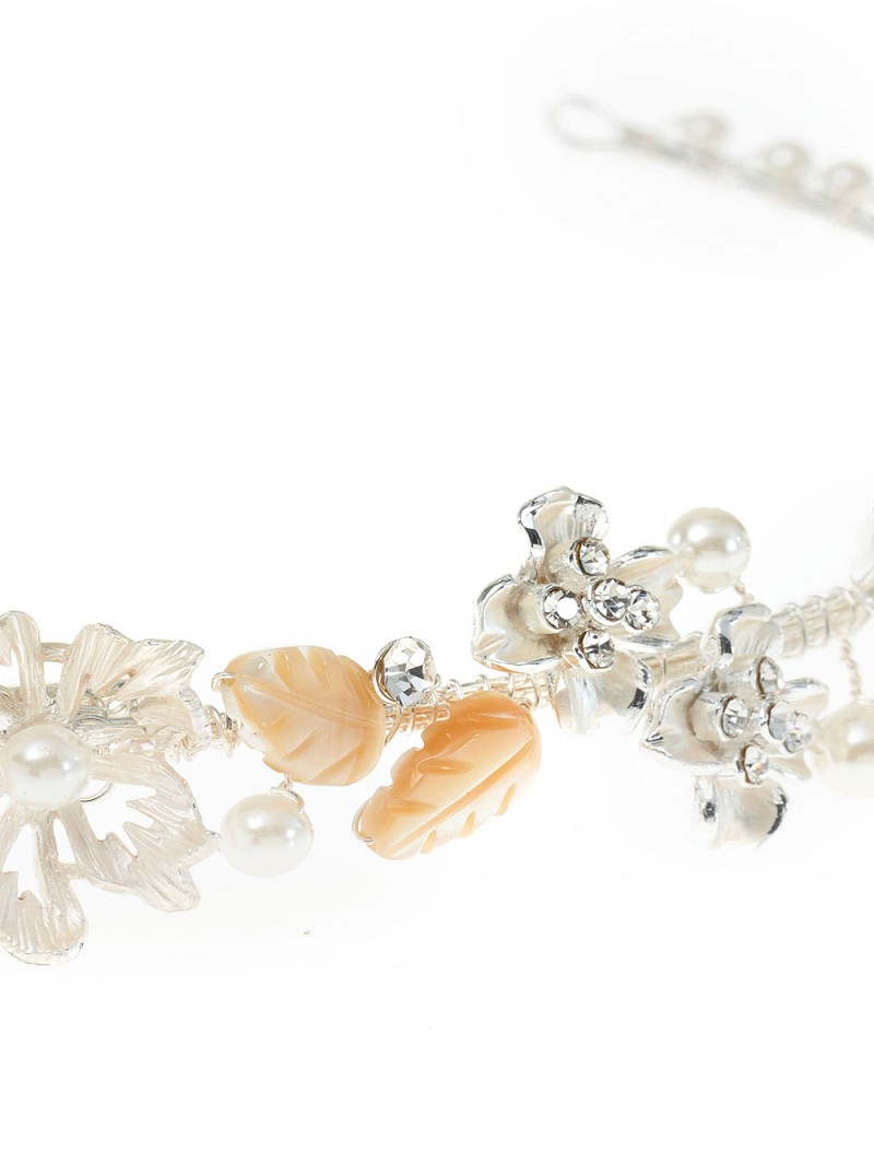 - zilverkleurige basis, zilverkleurige bloemetjes, parelmoerkleurige blaadjes, ivoorkleurige parels en strasssteentjes