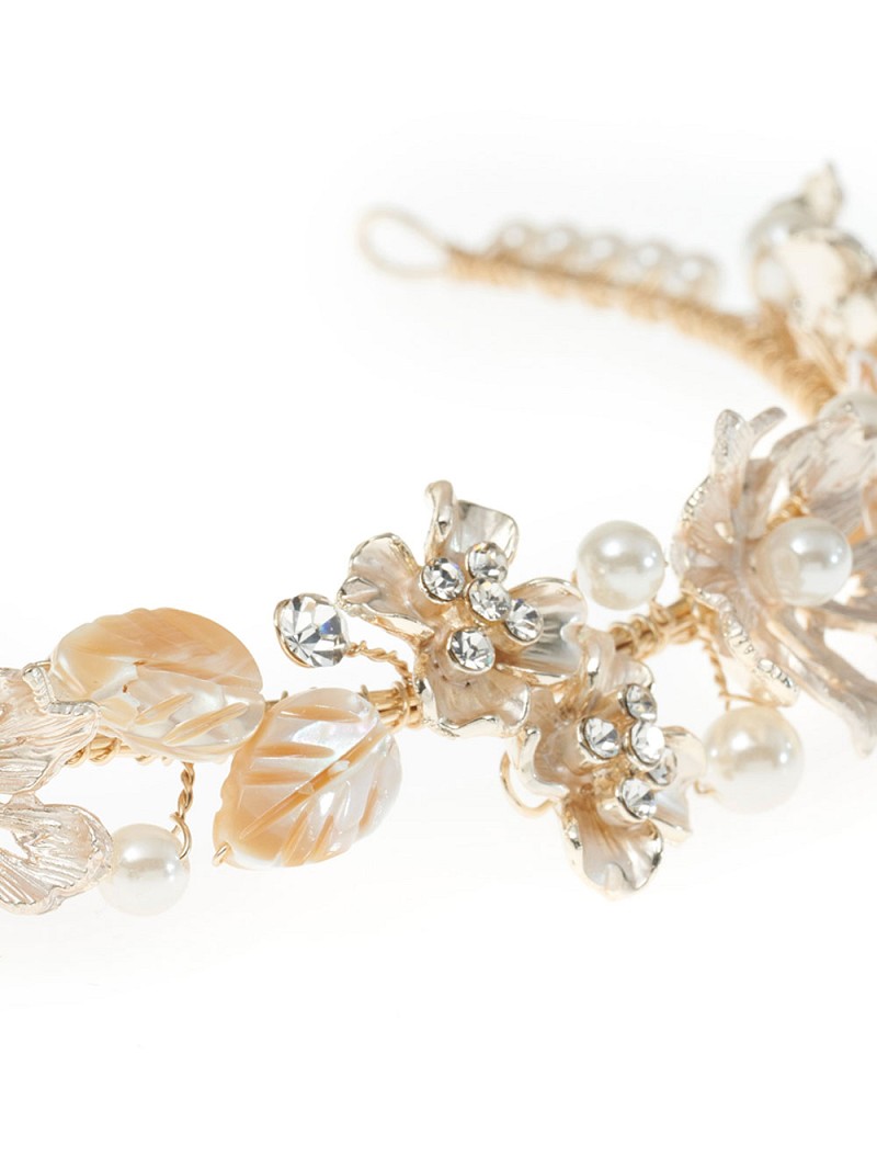 - goudkleurige basis, goudkleurige bloemetjes, parelmoerkleurige blaadjes, ivoorkleurige parels en strasssteentjes