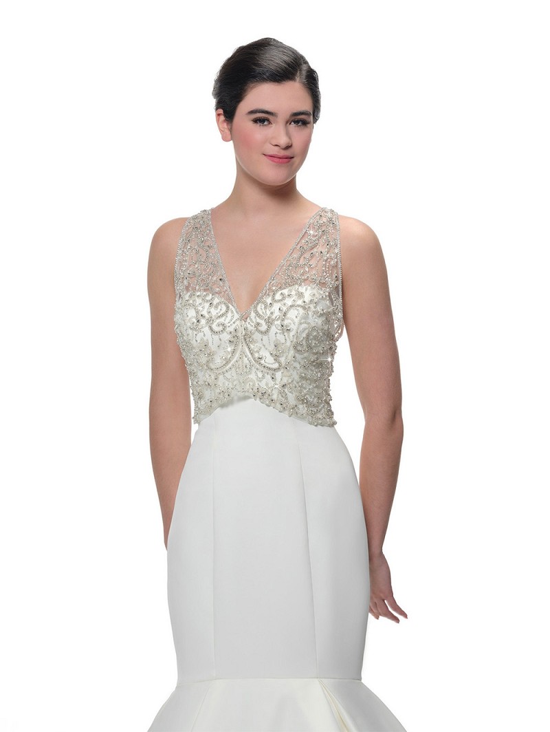 - Kies voor de luxe wedding-top T-101 als je graag een romantische wedding-look tijdens je grote dag. Deze ivoorkleurige top heeft een mouwloos design en een diepe V-hals. Daarnaast heeft de top een schitterende versiering van grote en kleine kraaltjes, kristalletjes, strasssteentjes en pareltjes. De top is verkrijgbaar in 4 verschillende maten, namelijk: 36, 38, 40 en 42. Combineer deze deluxe top met een overrok of bustier van Poirier.